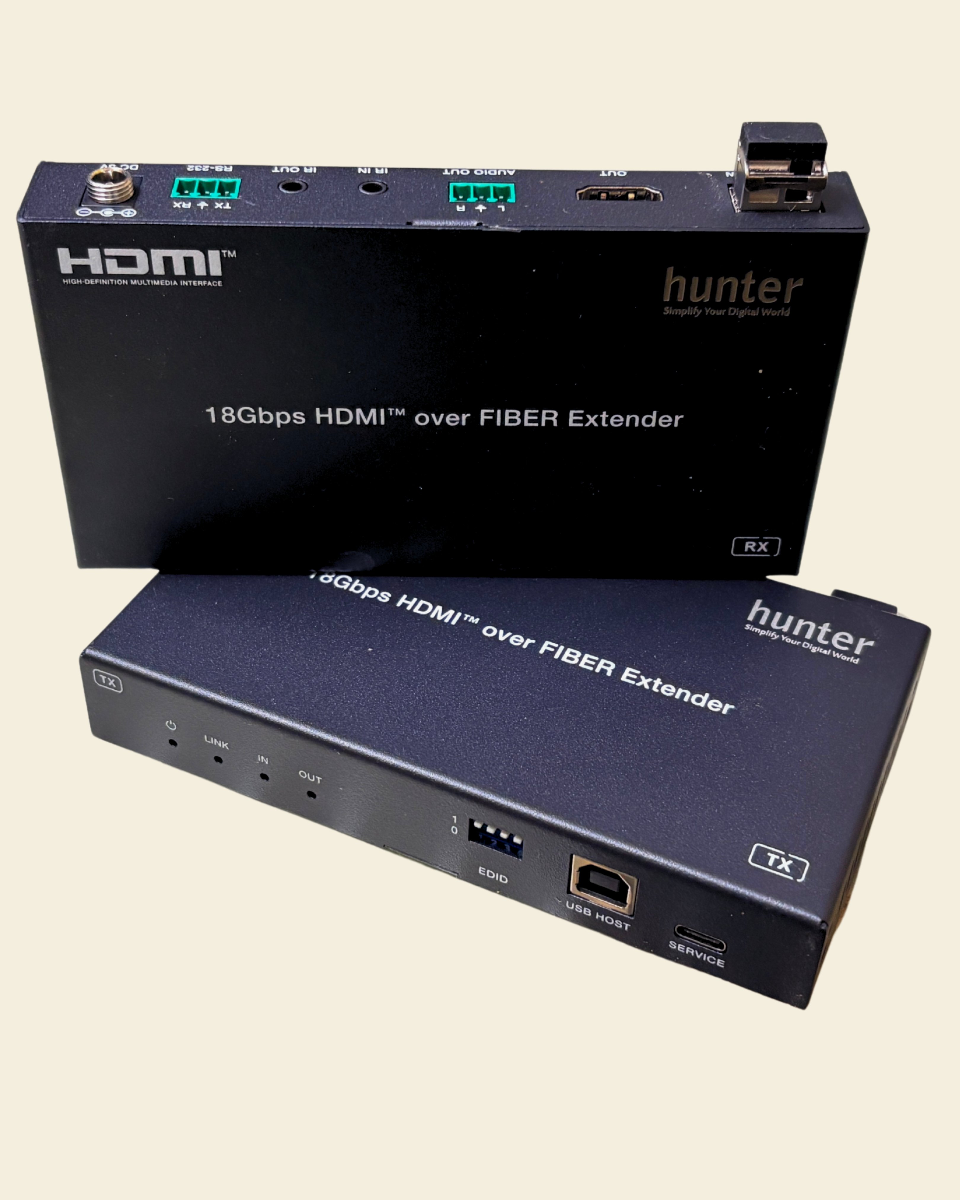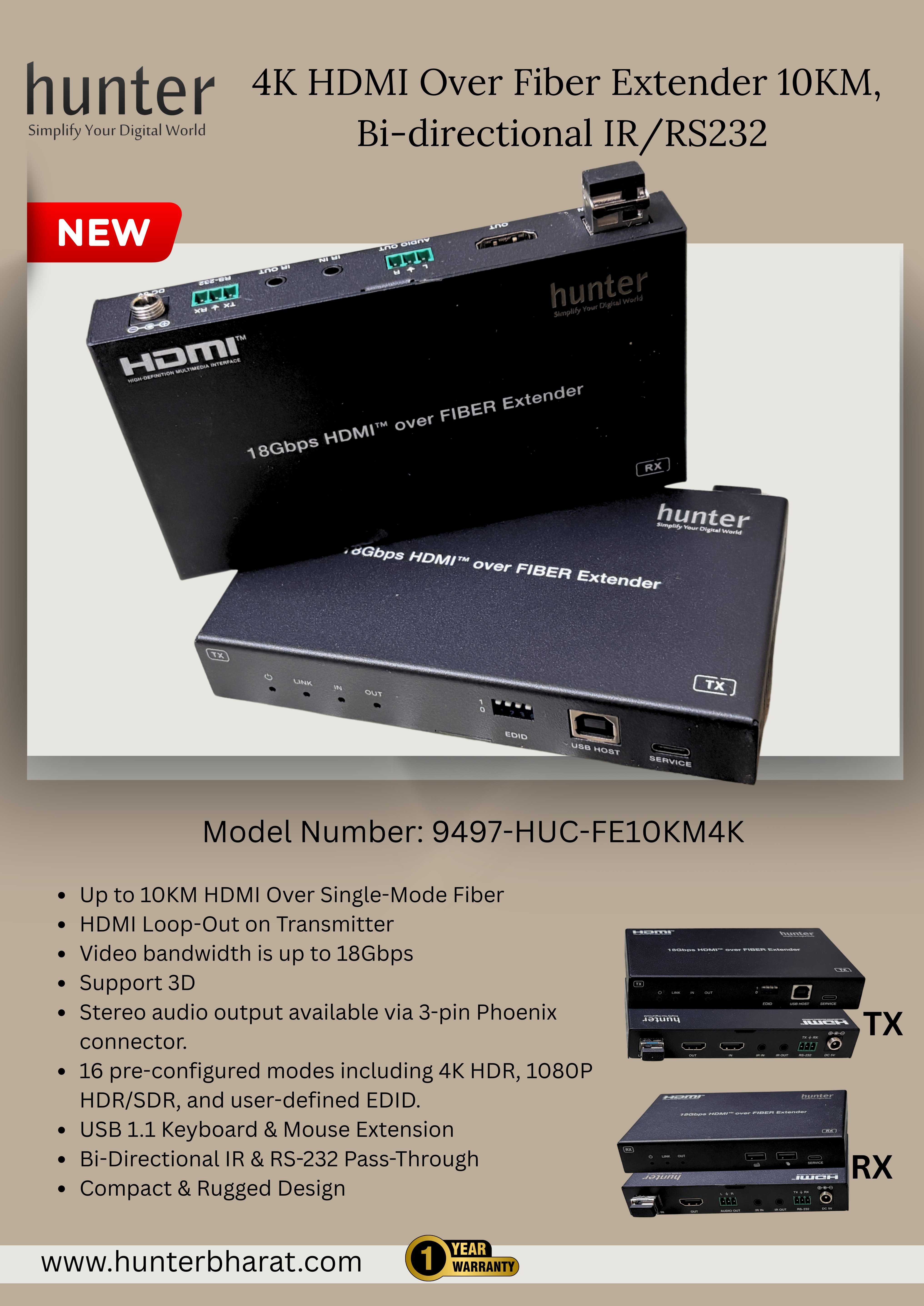 The Hunter 9497 HDMI over Fiber Extender enables uncompressed 4K60Hz 4:4:4 HDMI transmission up to 10 kilometers over single-mode fiber. Designed for critical AV deployments, this extender pair includes bi-directional IR and RS-232 pass-through, USB 1.1 keyboard/mouse support, and advanced EDID management. The transmitter includes HDMI loop-out, while the receiver supports analog audio de-embedding, making this the ideal solution for broadcast environments, digital signage, control rooms, and secure fiber-based video transmission setups.