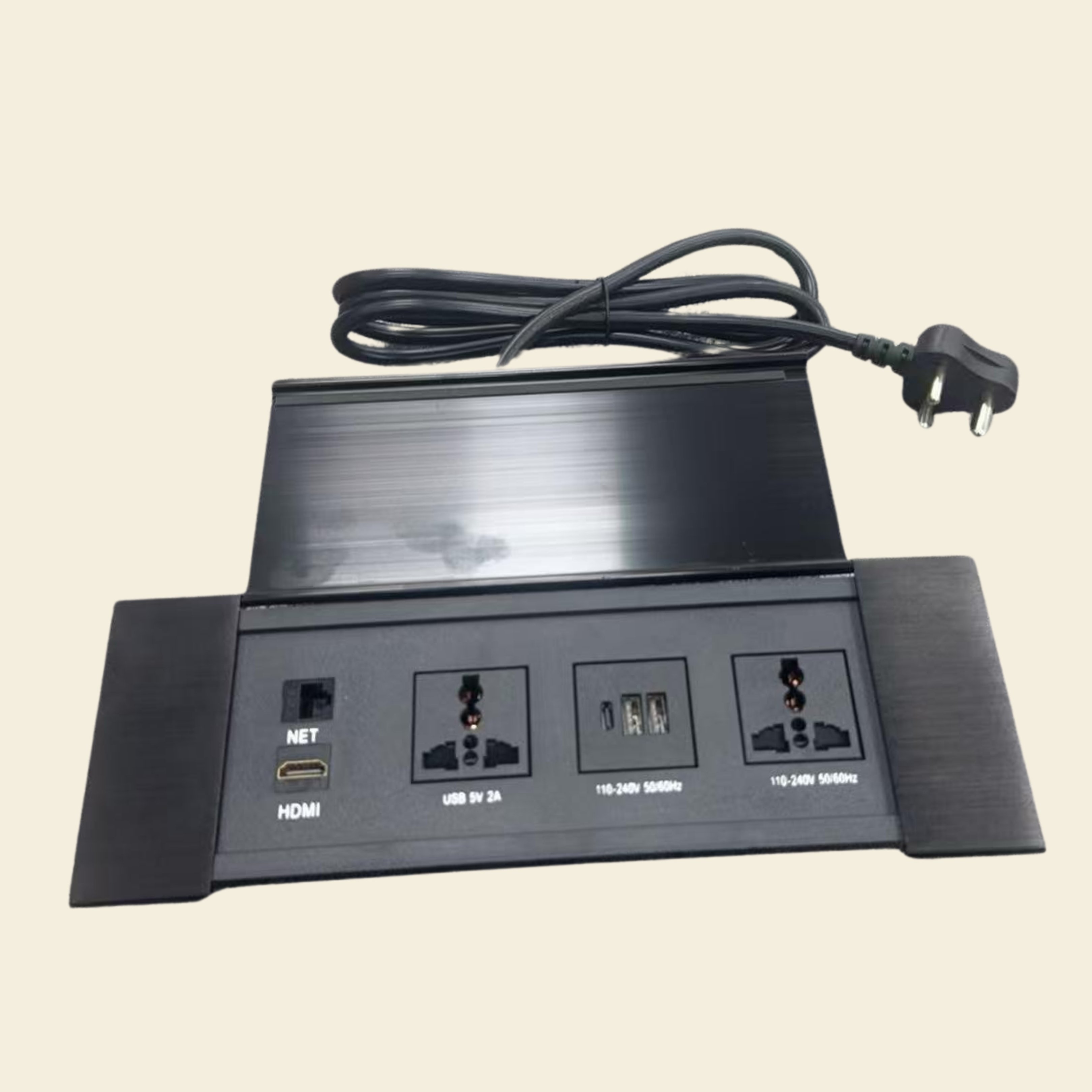 The flip lid opens smoothly to reveal universal power sockets, HDMI 2.0, RJ45, USB charging, and Type C PD, providing clean, user-accessible I/O at the tabletop. Built with aluminum and polycarbonate materials, and available in black or silver finish, it supports seamless wiring via screw-terminal and feed-through connectors.