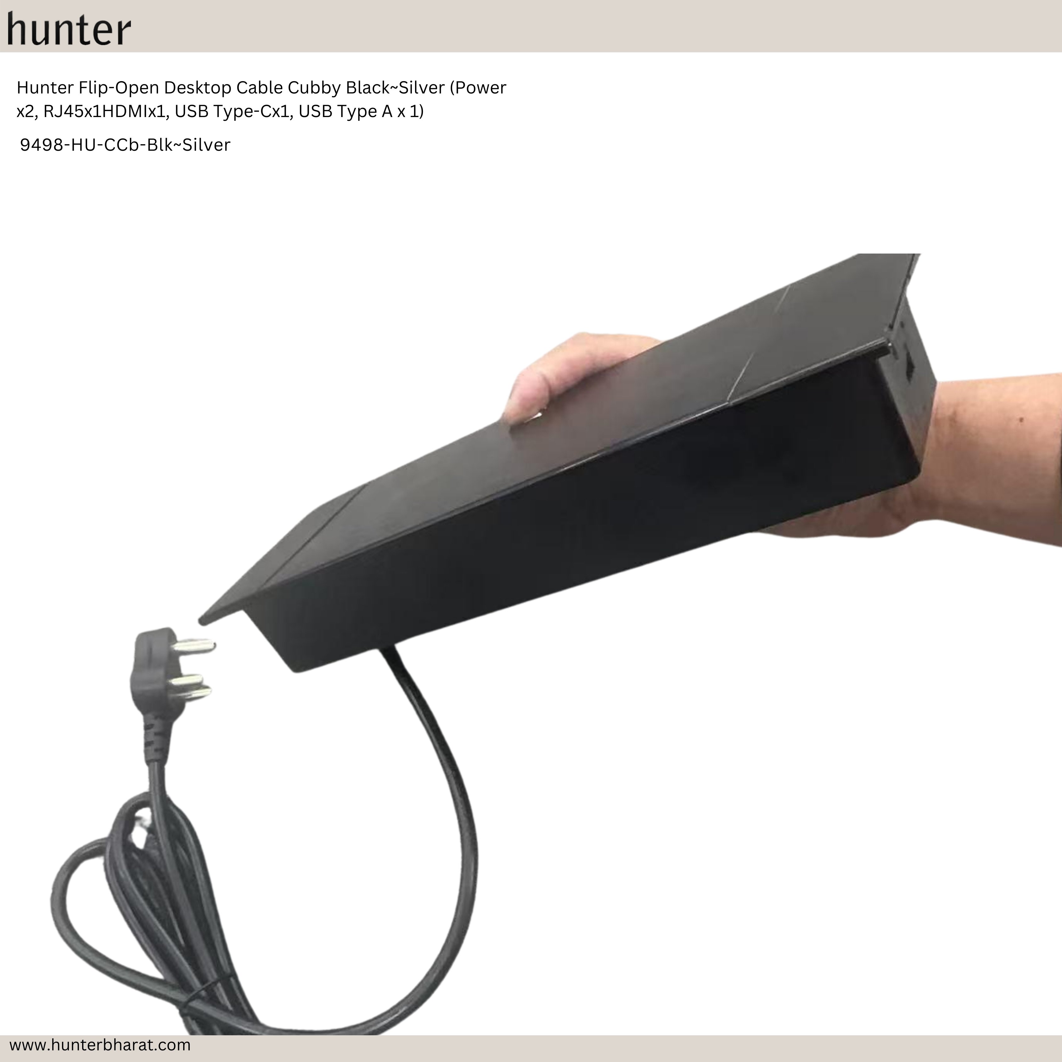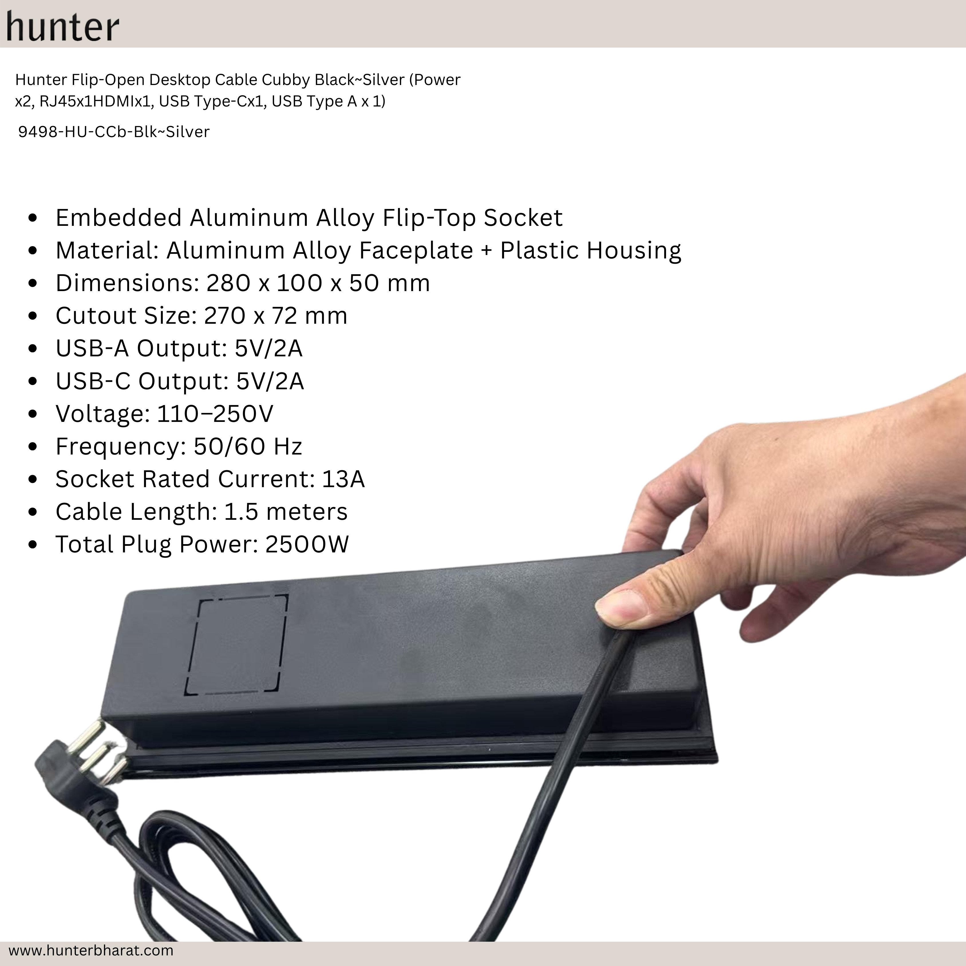 The Hunter 9498-HU-CCb-Blk~Silver is a premium desktop cable cubby enclosure that combines multi-format connectivity and power into a sleek, flip-open form factor. Designed for boardrooms, workstations, training centers, and AV conference tables, it features a blend of power, AV, USB, data, and network ports in a sturdy aluminum housing.