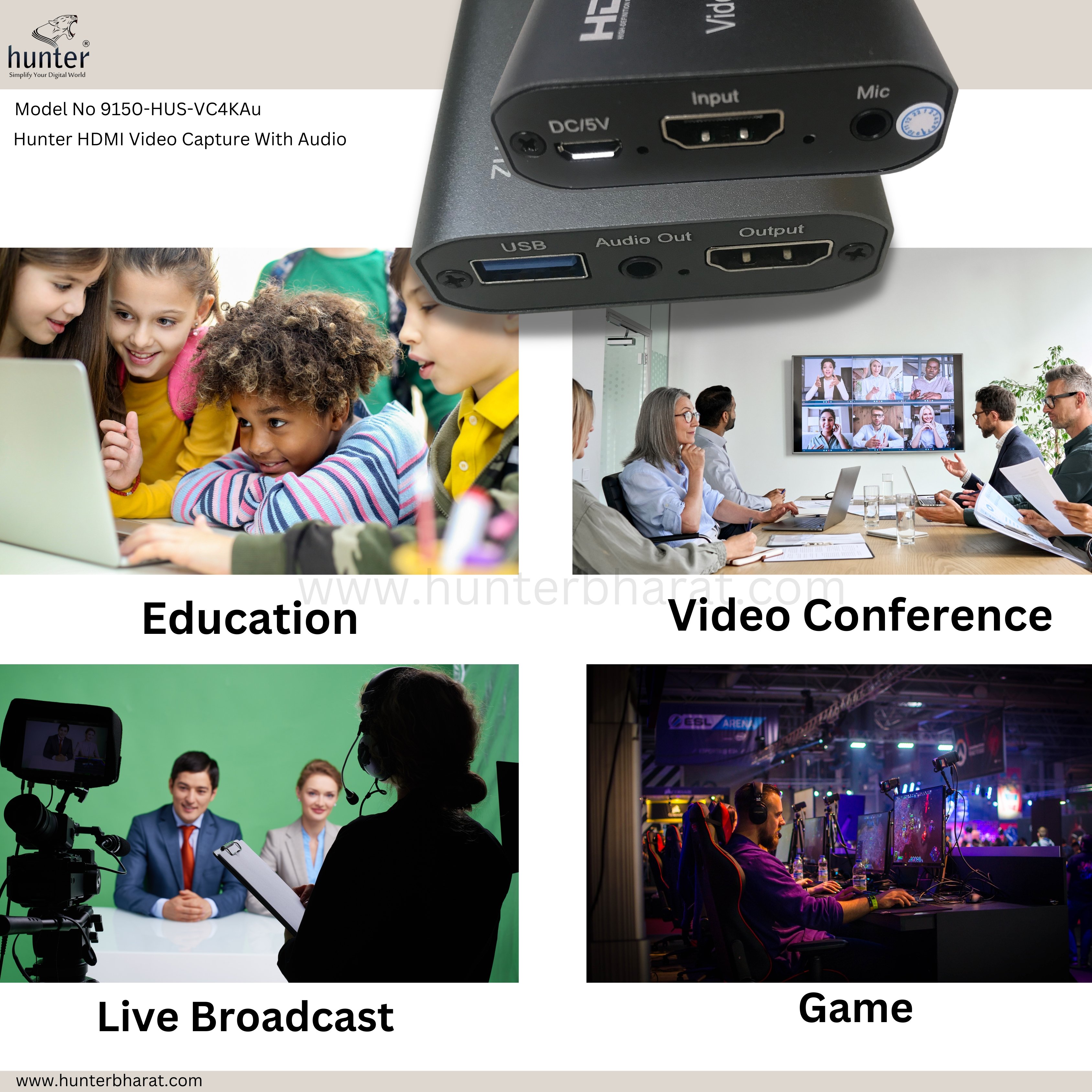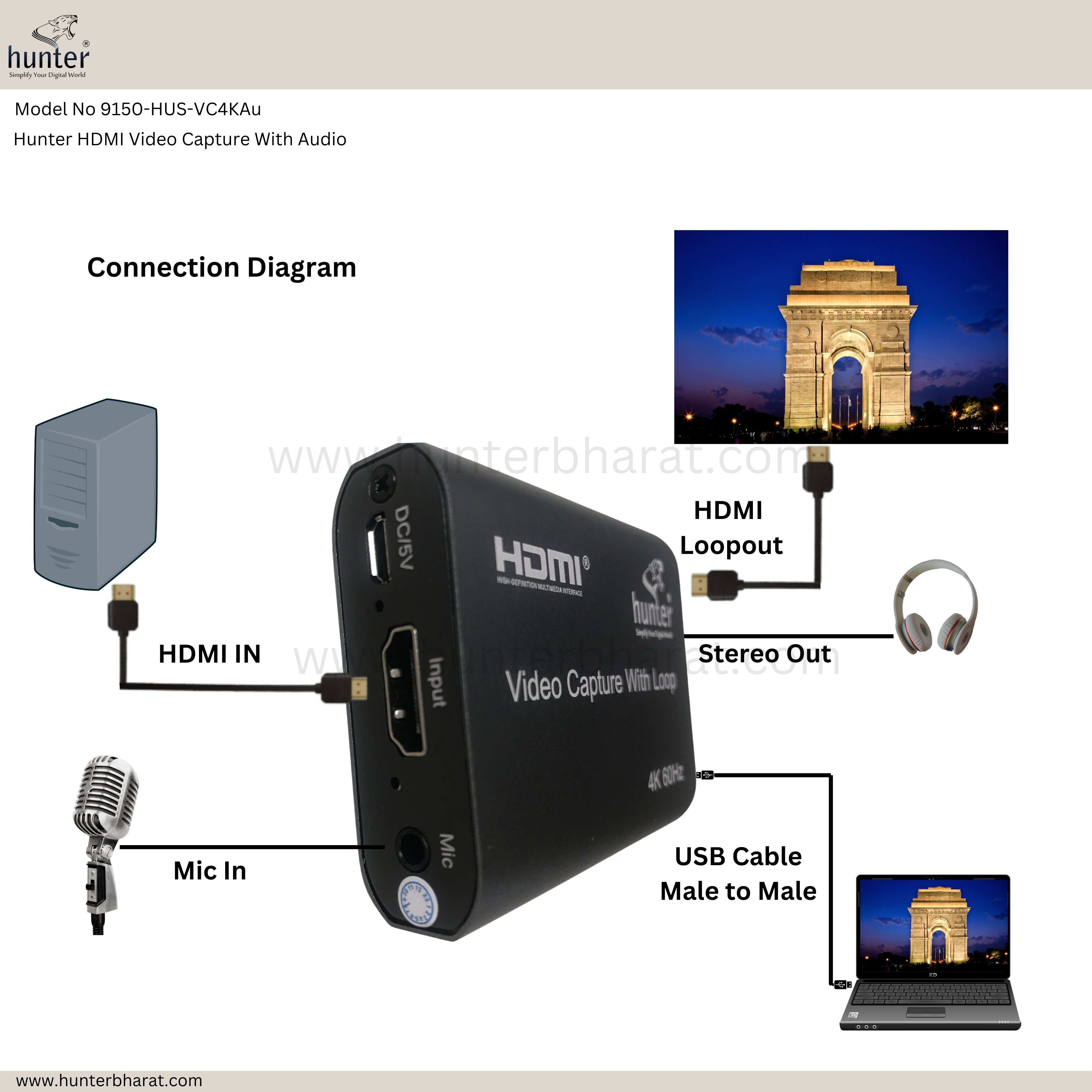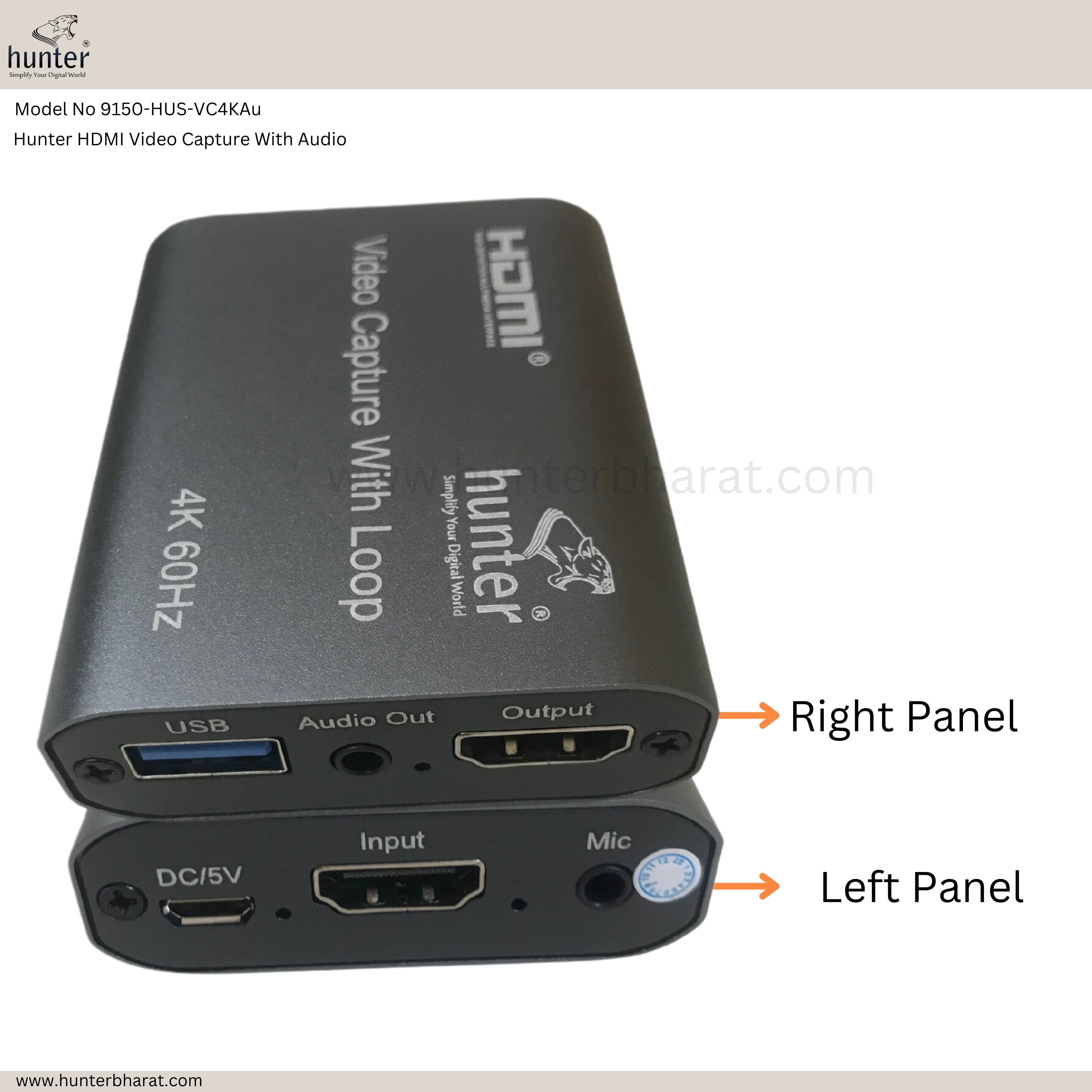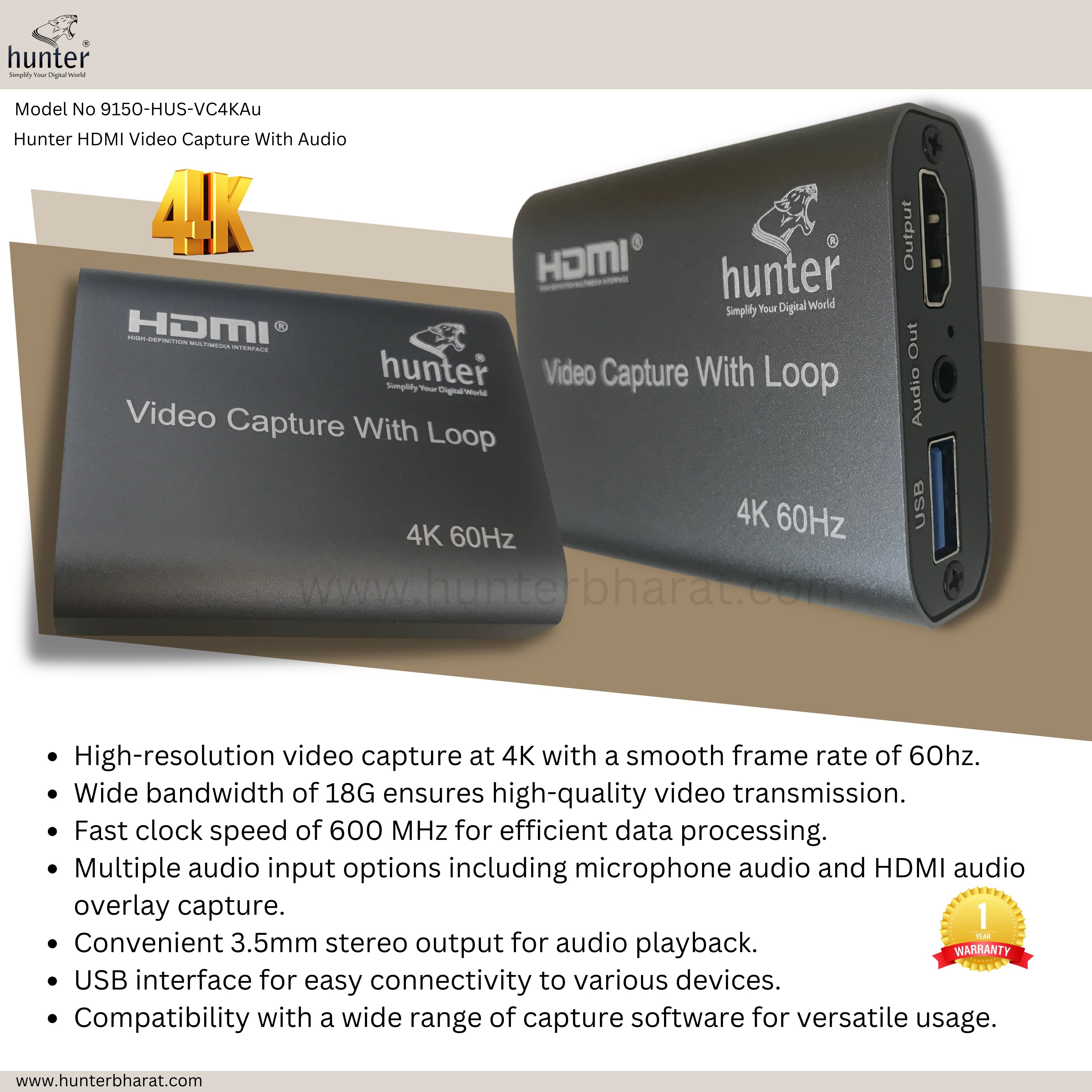 9150-HUS-VC4KAu-Hunter HDMI Video Capture records 4K@60hz content with audio. It features 18G bandwidth, 600 MHz clock, stereo output, microphone input, HDMI audio overlay capture, and compatibility with various capture software.