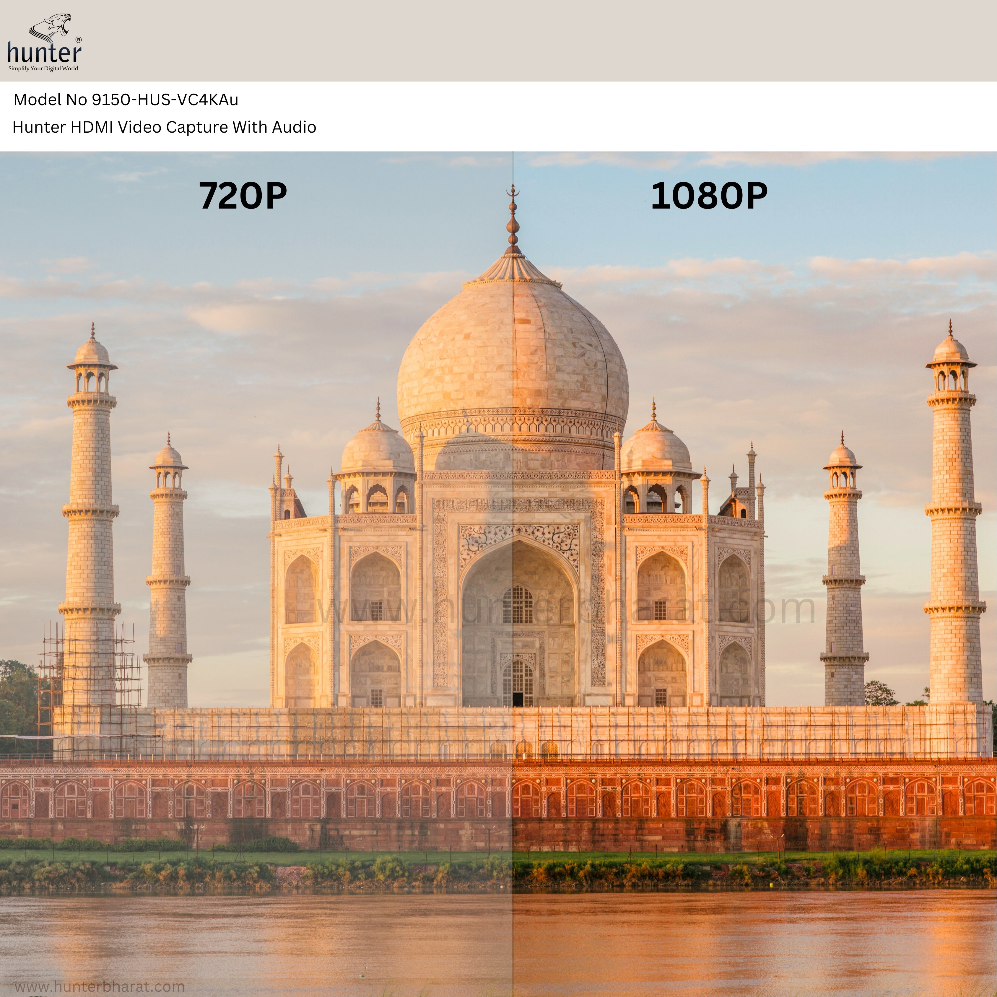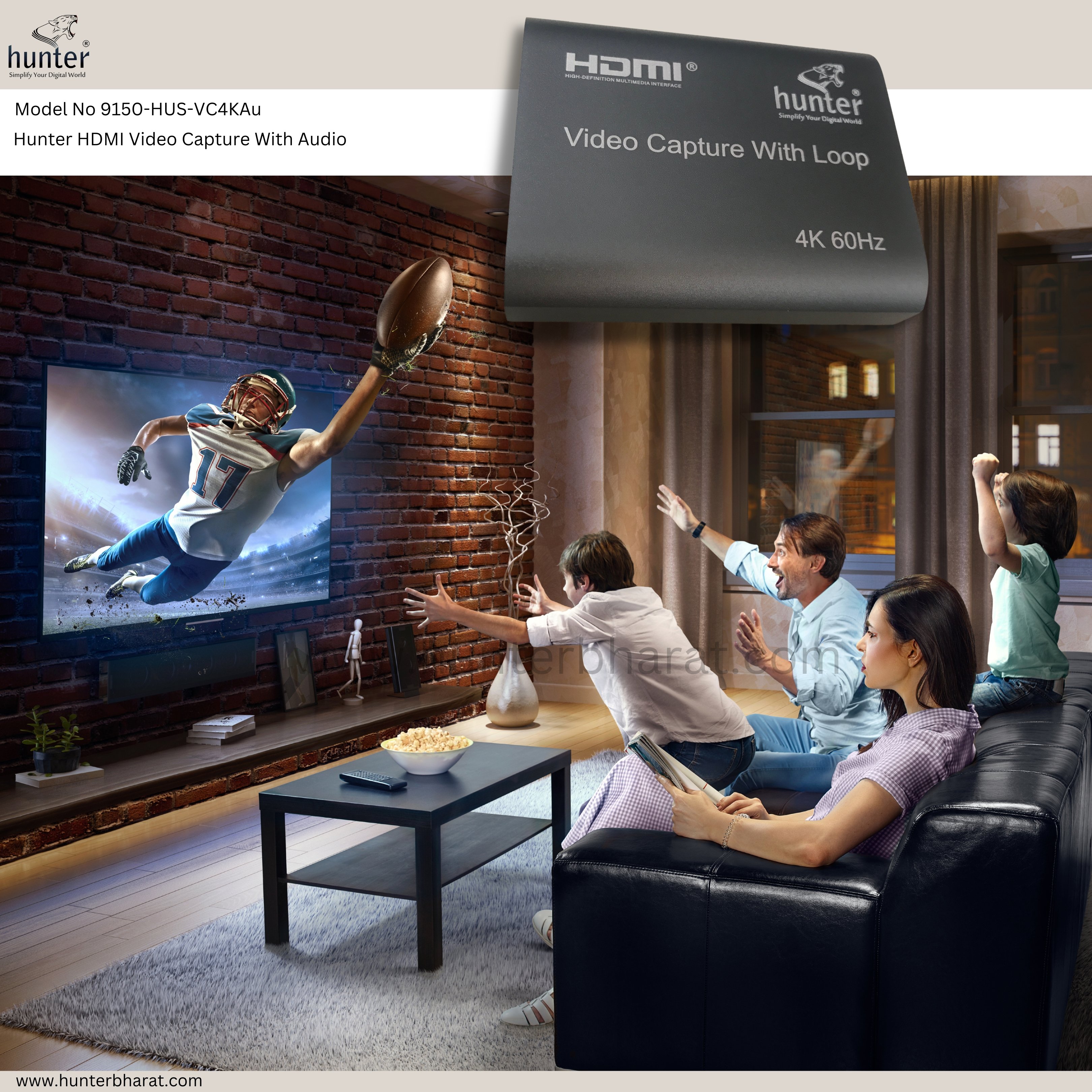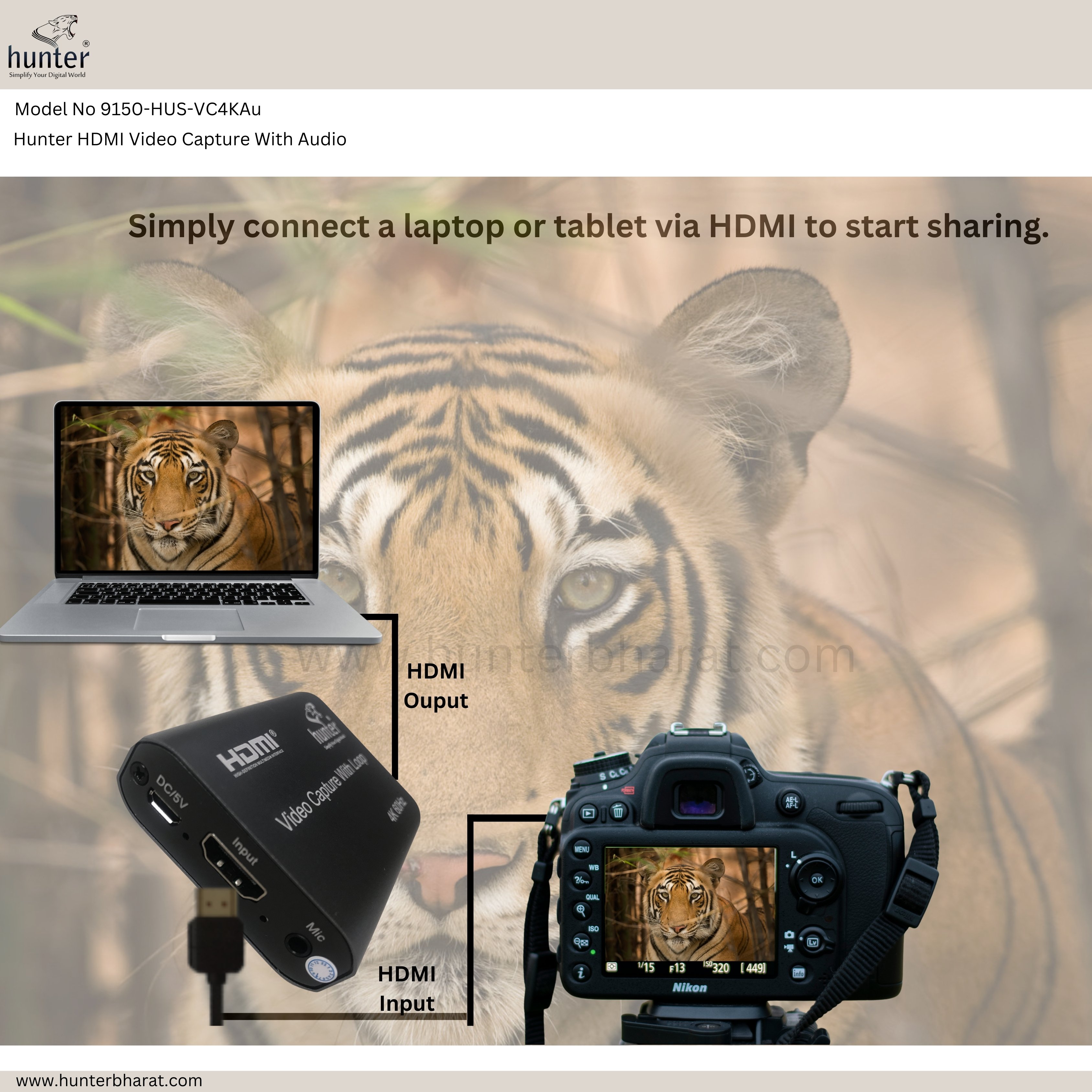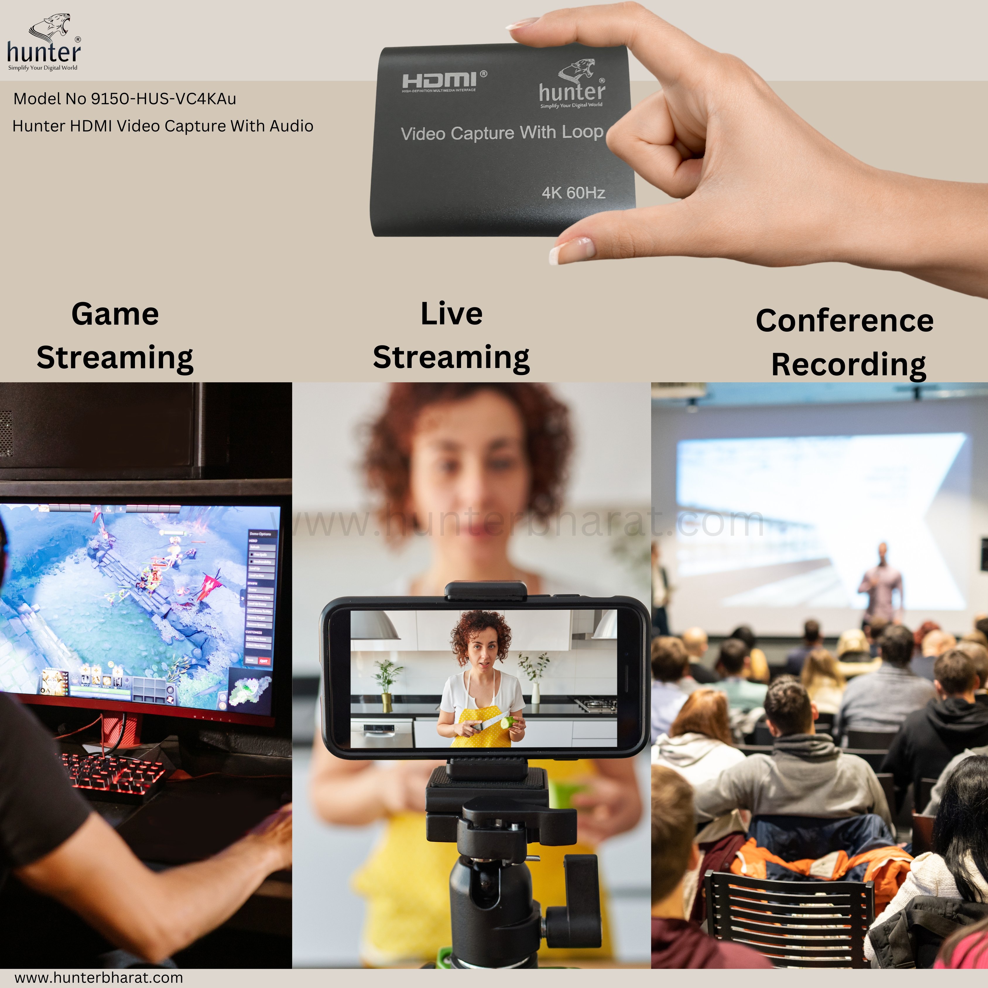 9150-HUS-VC4KAu-Hunter HDMI Video Capture records 4K@60hz content with audio. It features 18G bandwidth, 600 MHz clock, stereo output, microphone input, HDMI audio overlay capture, and compatibility with various capture software.