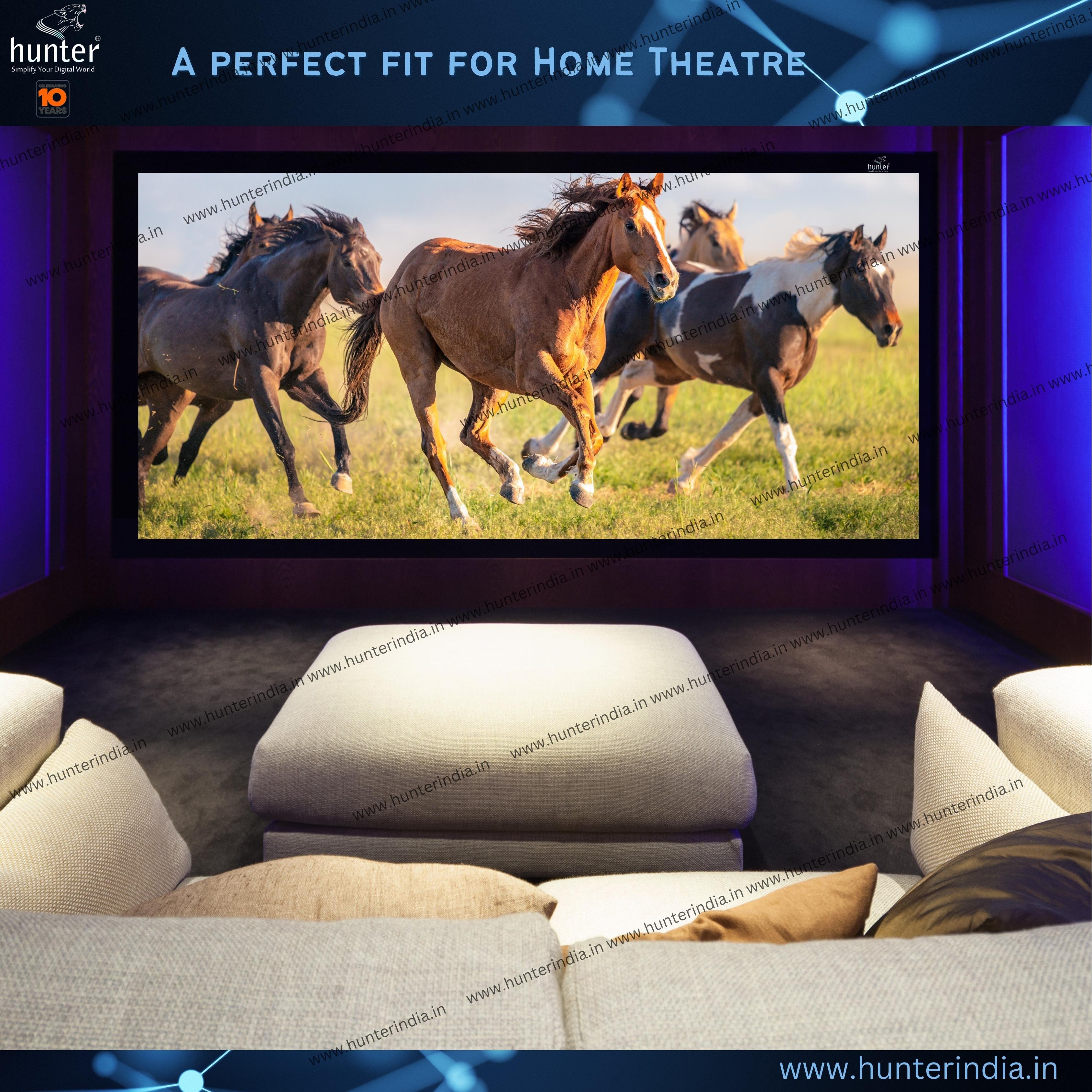 9131-HUL-SCFF135169-M3D Hunter HGPLR Projection Screen: A stunning 135" fixed frame screen, 16:9 aspect ratio, metal finish 3D fabric, mildew & fire-resistant, with high-gain polarized & light-reducing capabilities.