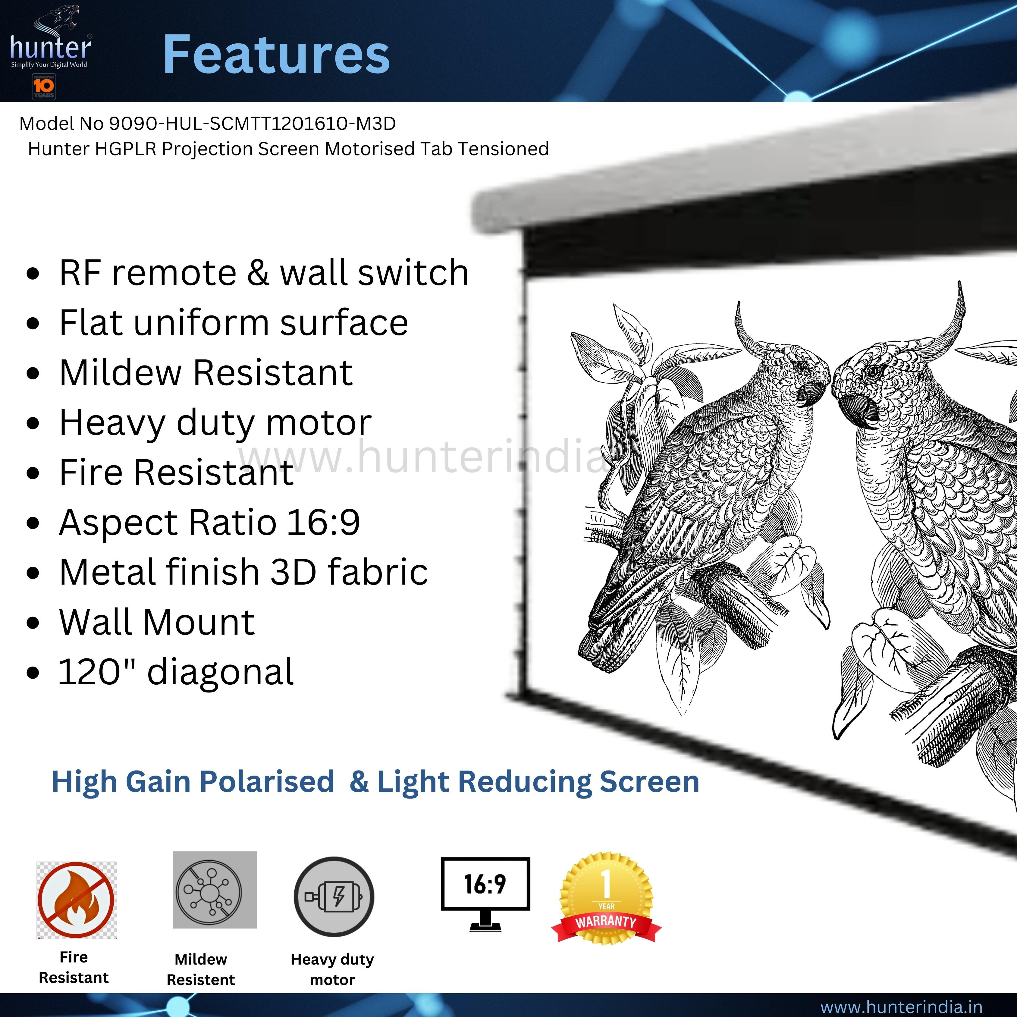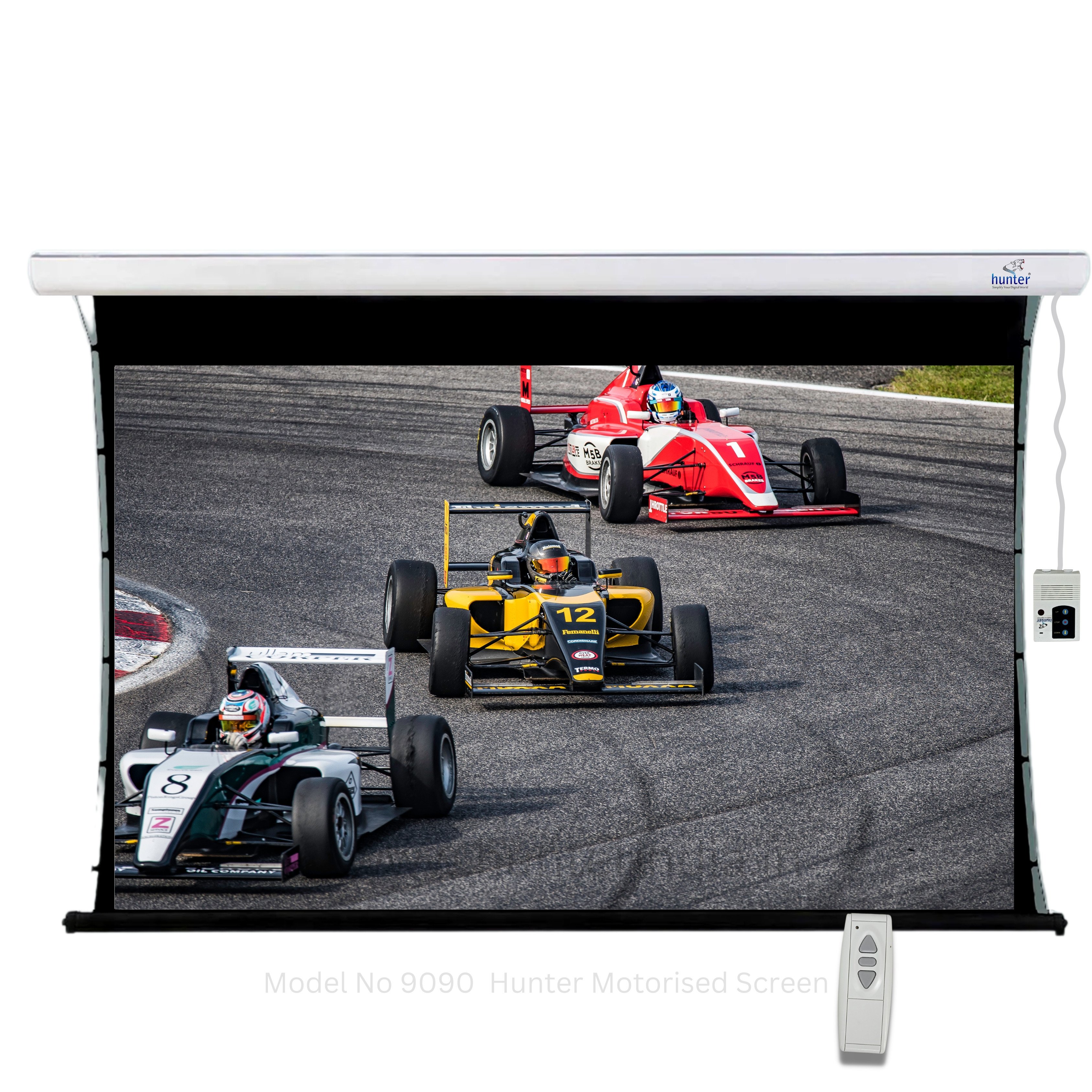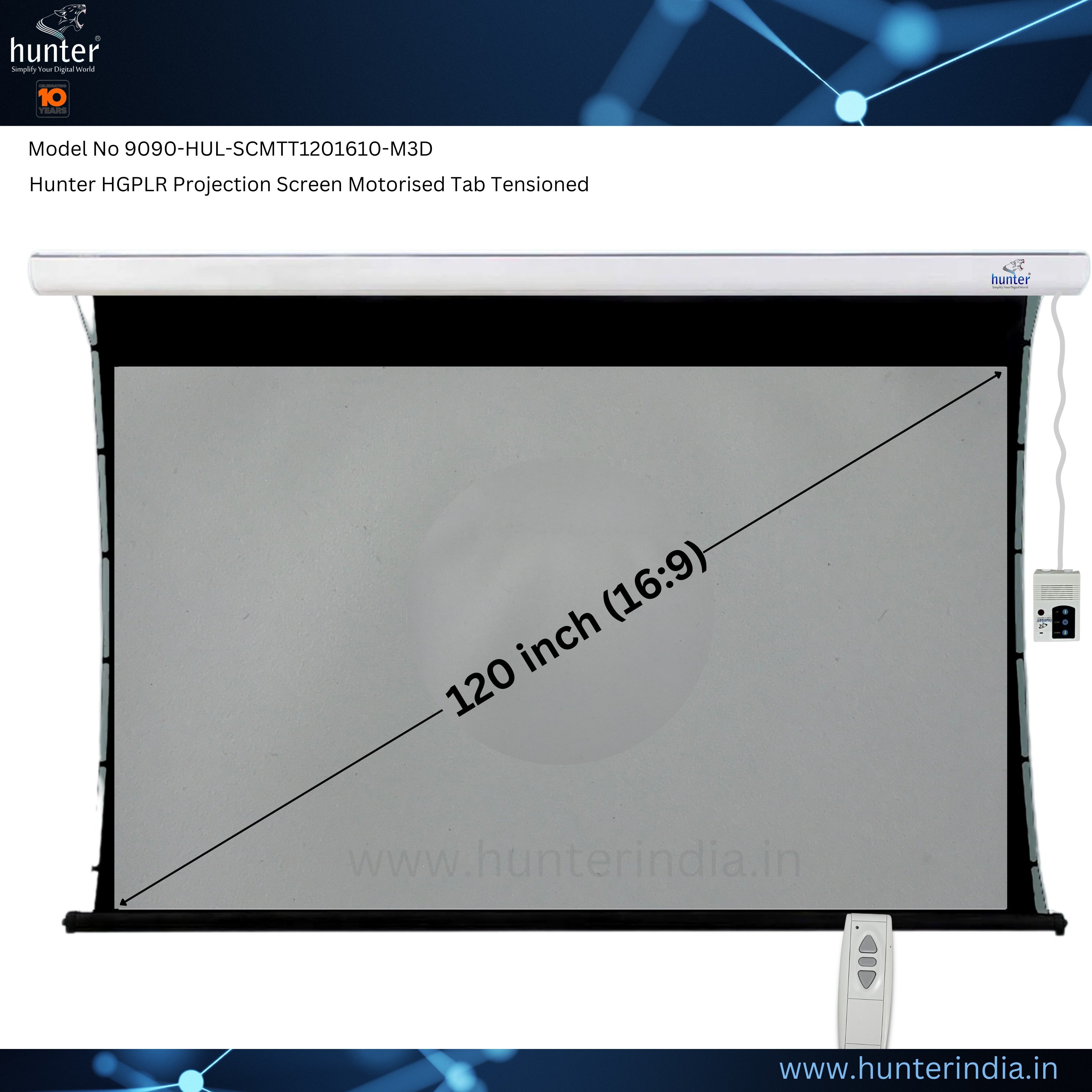 Hunter's Motorized Tab Tensioned Projection Screen - 120" Diagonal, 16:10 Aspect Ratio. Wall-mountable, featuring metal finish 3D fabric with high gain and a robust motor with RF remote.