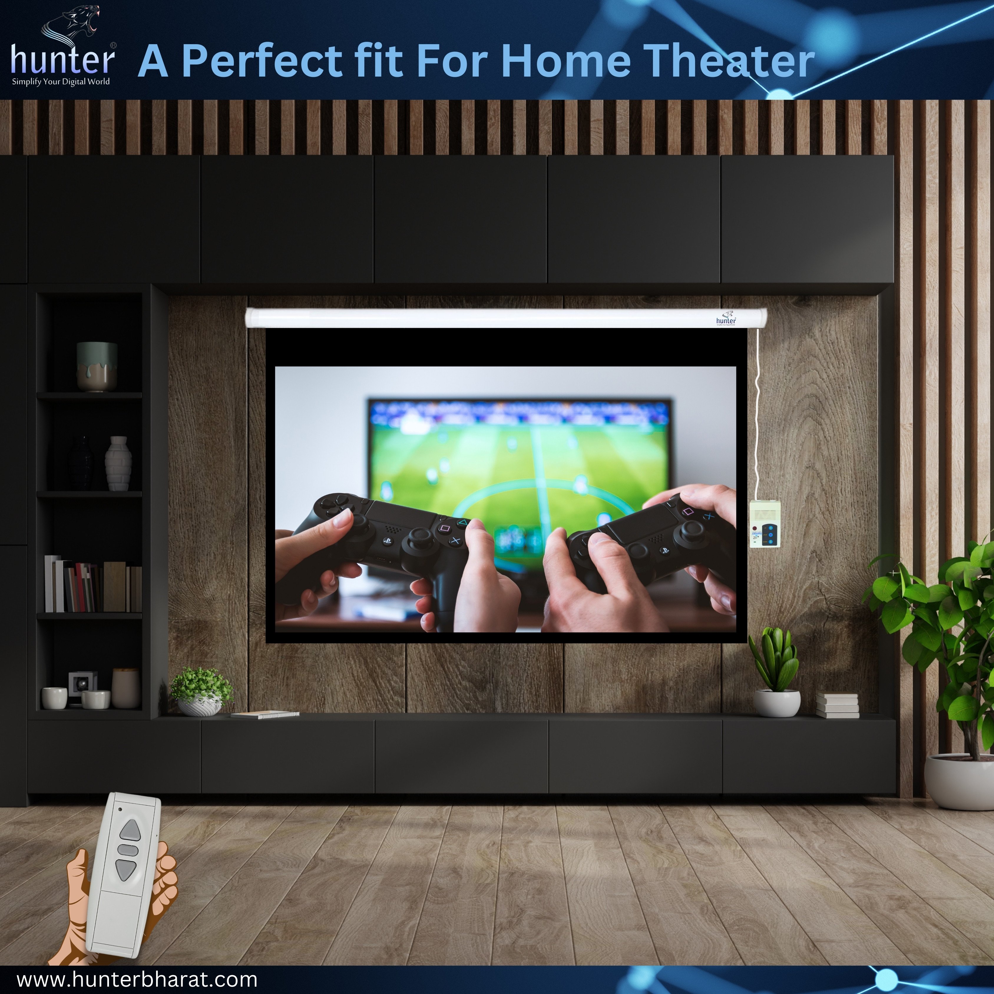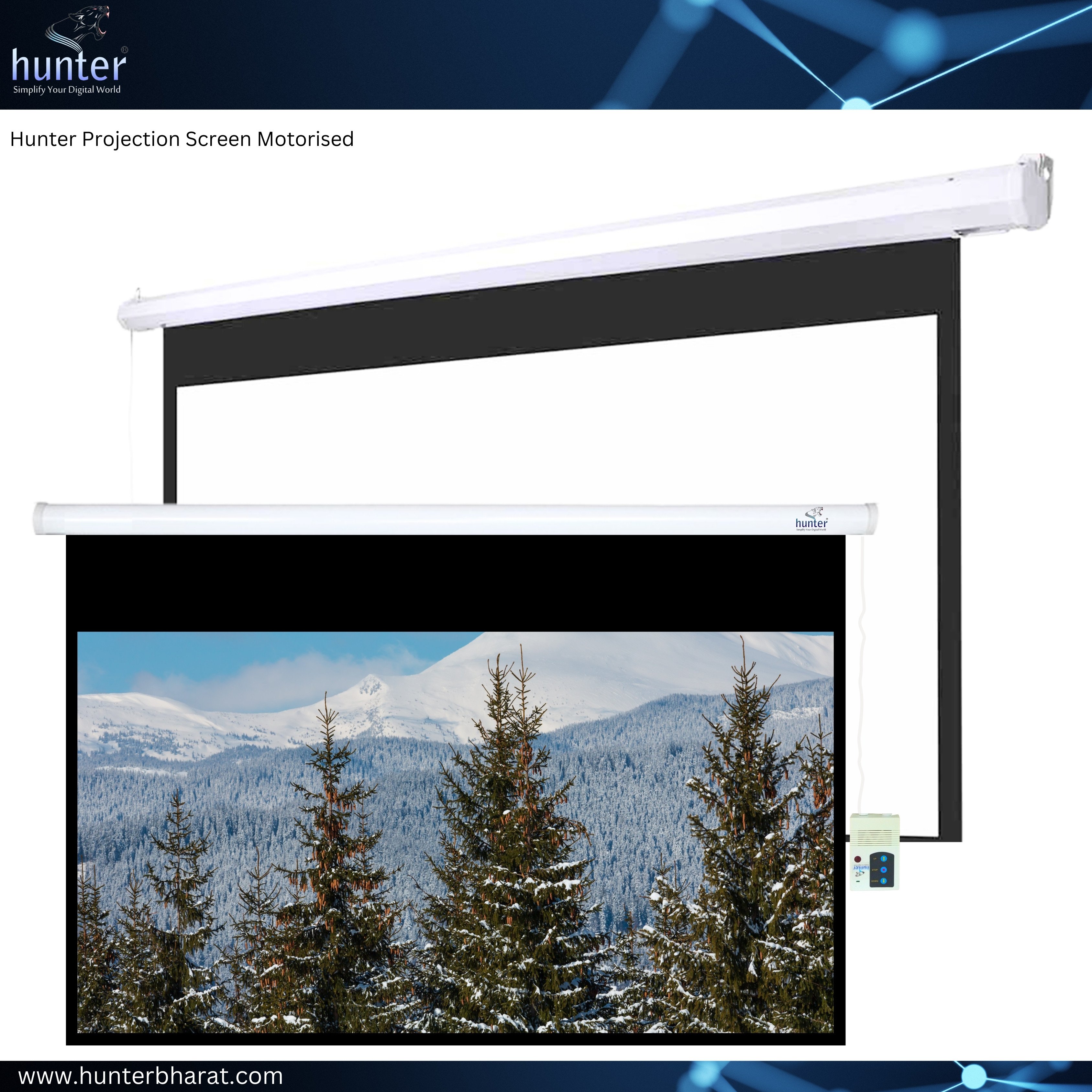 The Hunter Projection Screen is motorized, offering convenient remote-controlled operation.