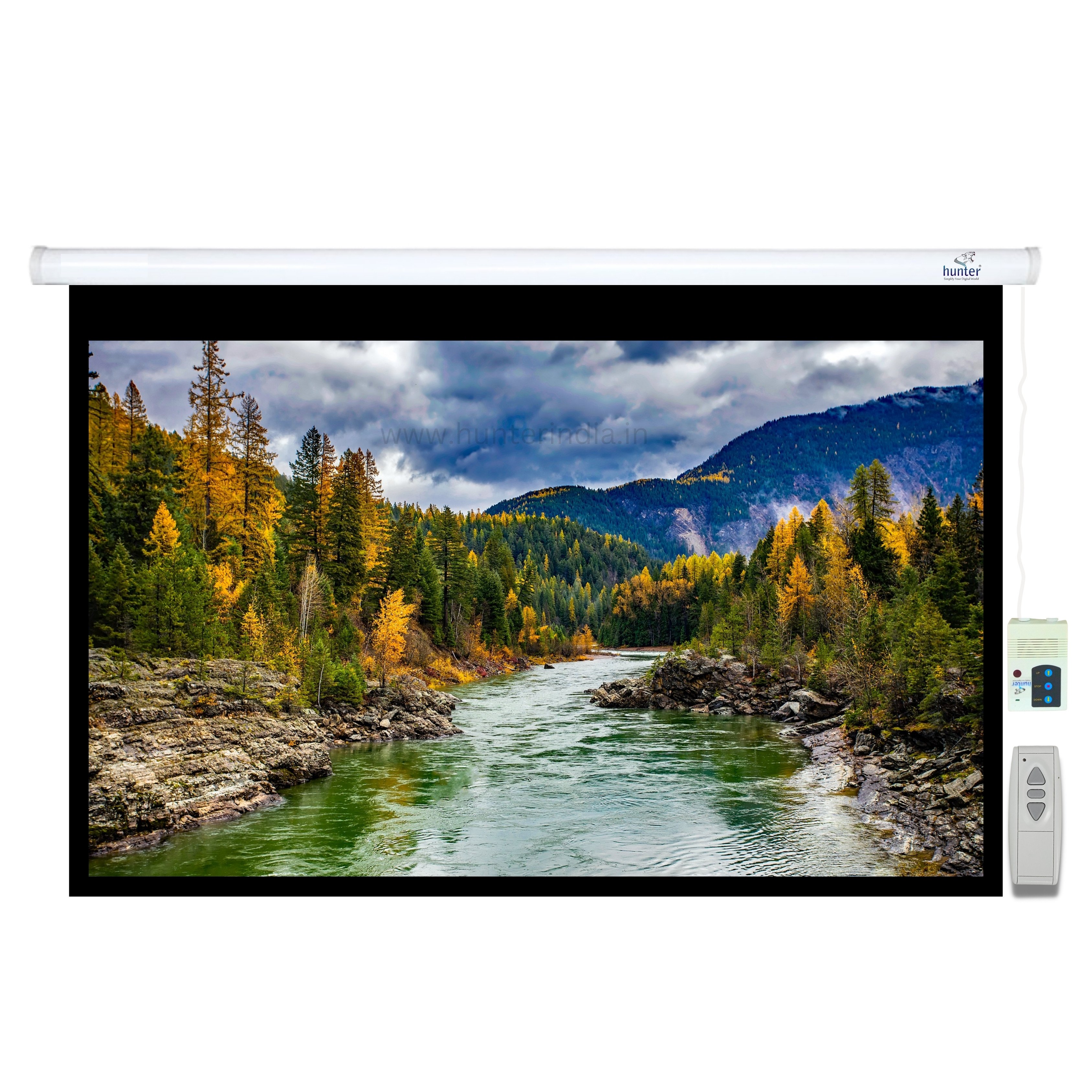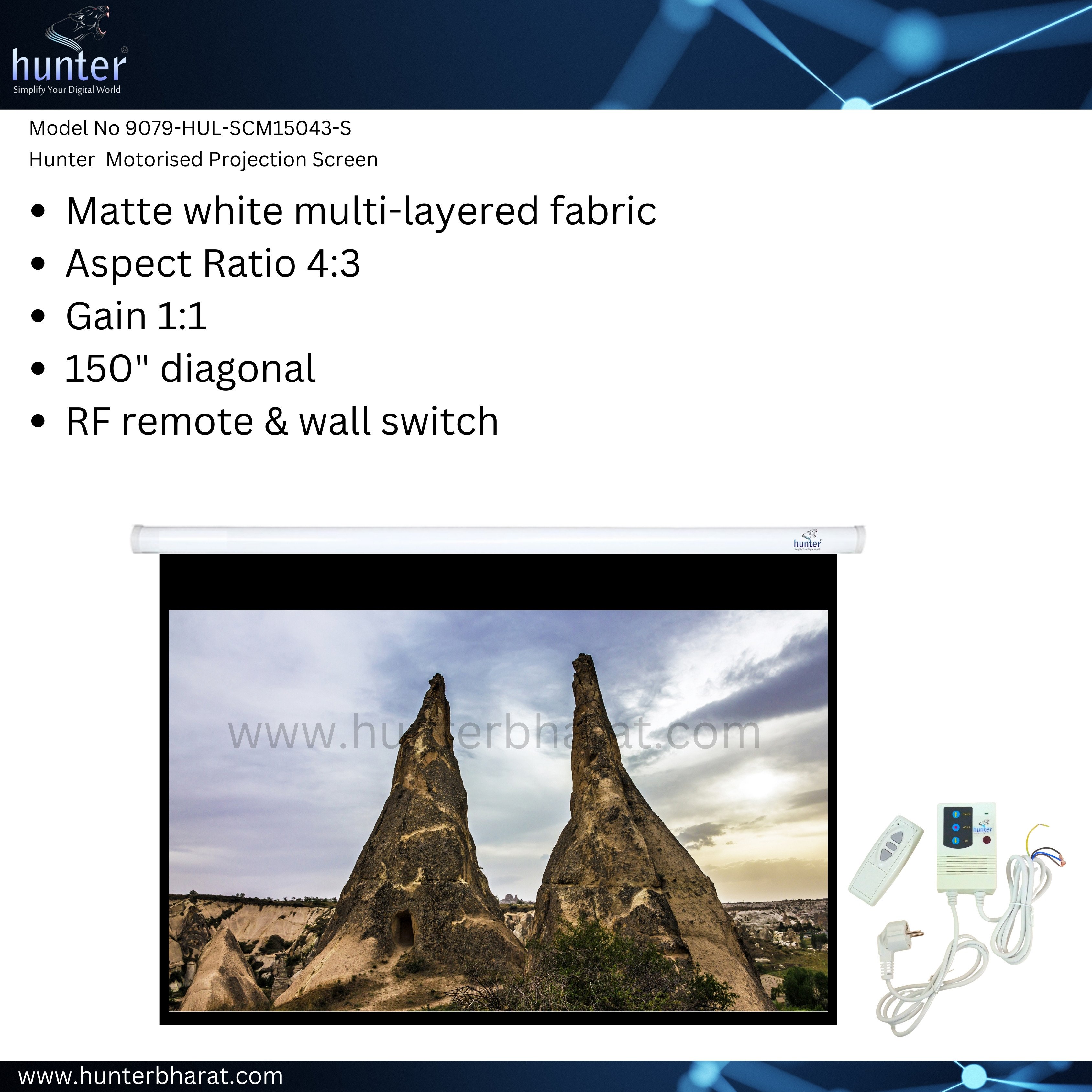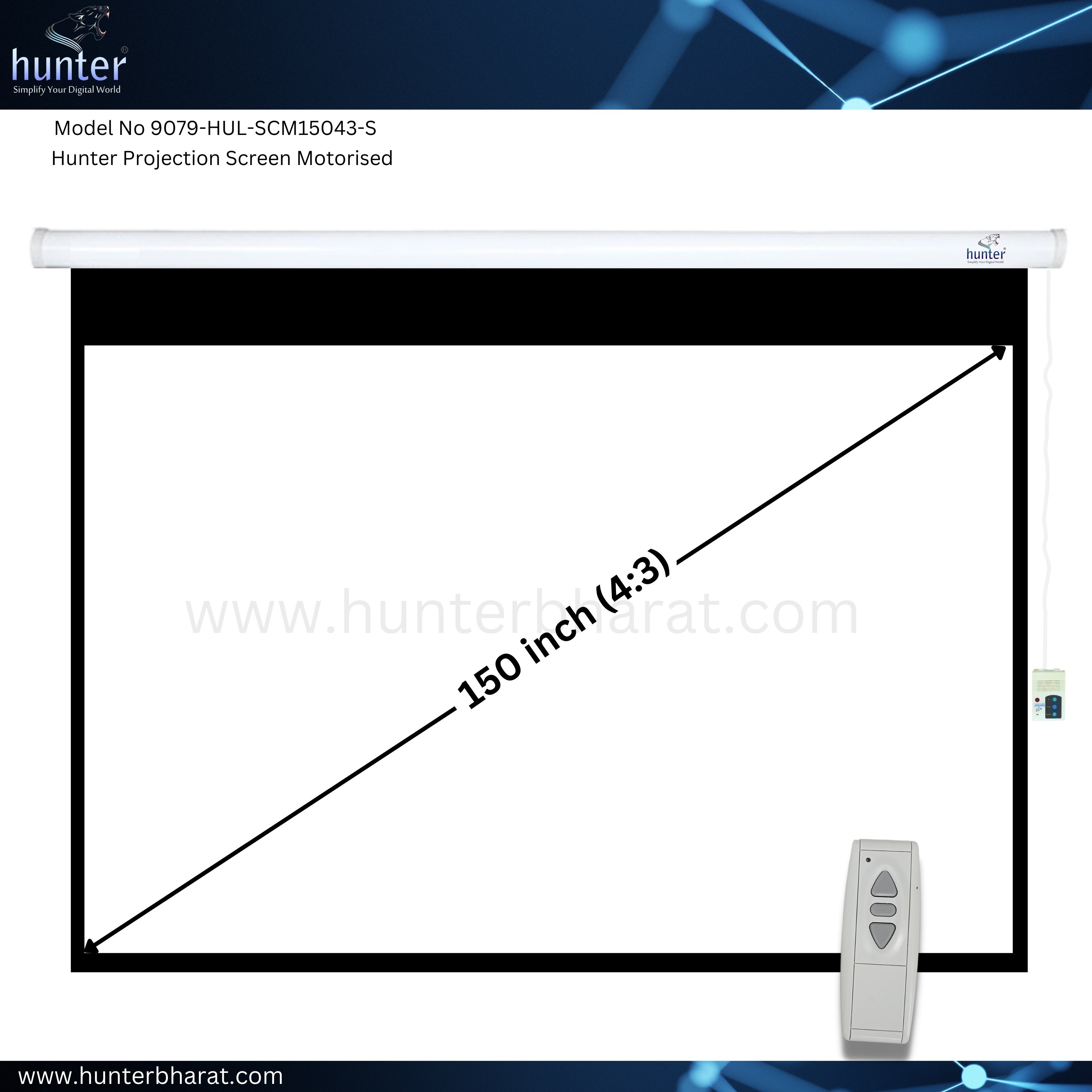 Hunter Projection Screen Motorized 150" diagonal, 8x10, Aspect Ratio 4:3, Matte White Multi-Layered Fabric, 1.1 Gain, Wall Mount, Steel Casing, with RF remote is the ultimate viewing experience for any home theatre or business presentation.