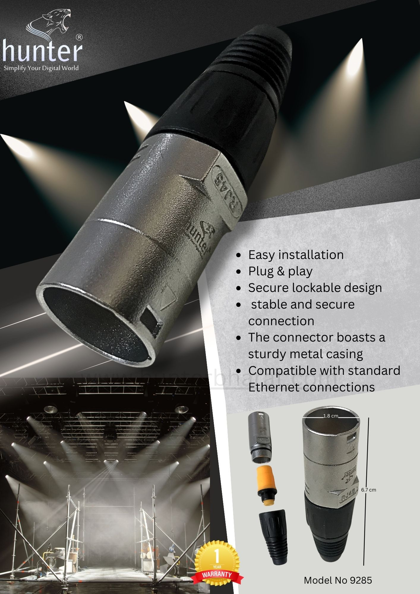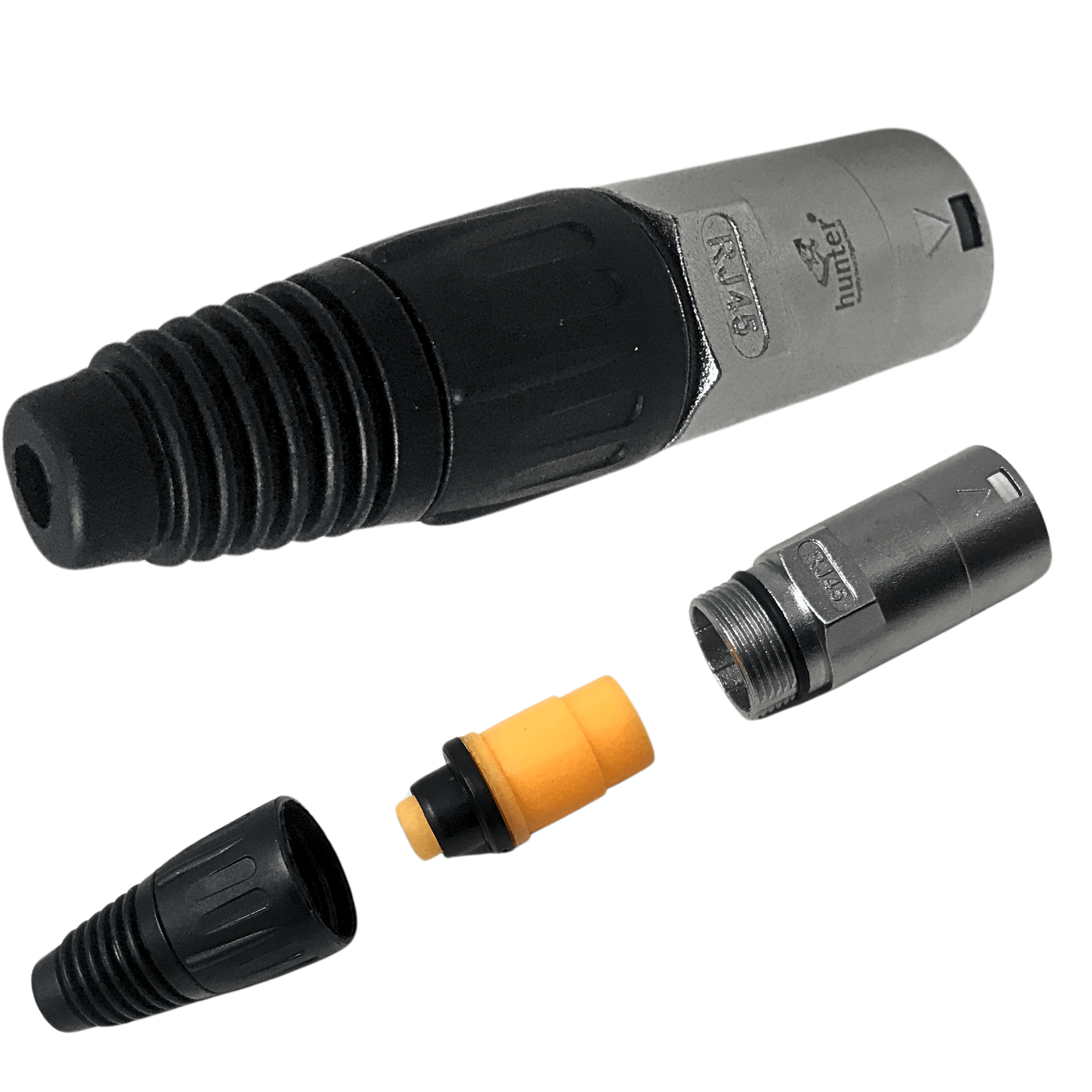 Hunter RJ45 Male Lockable Plug stands as a robust and durable heavy-duty connector, engineered for reliable performance in demanding environments. Its secure lockable design guarantees a stable and steadfast connection weight of the connector 29 grams