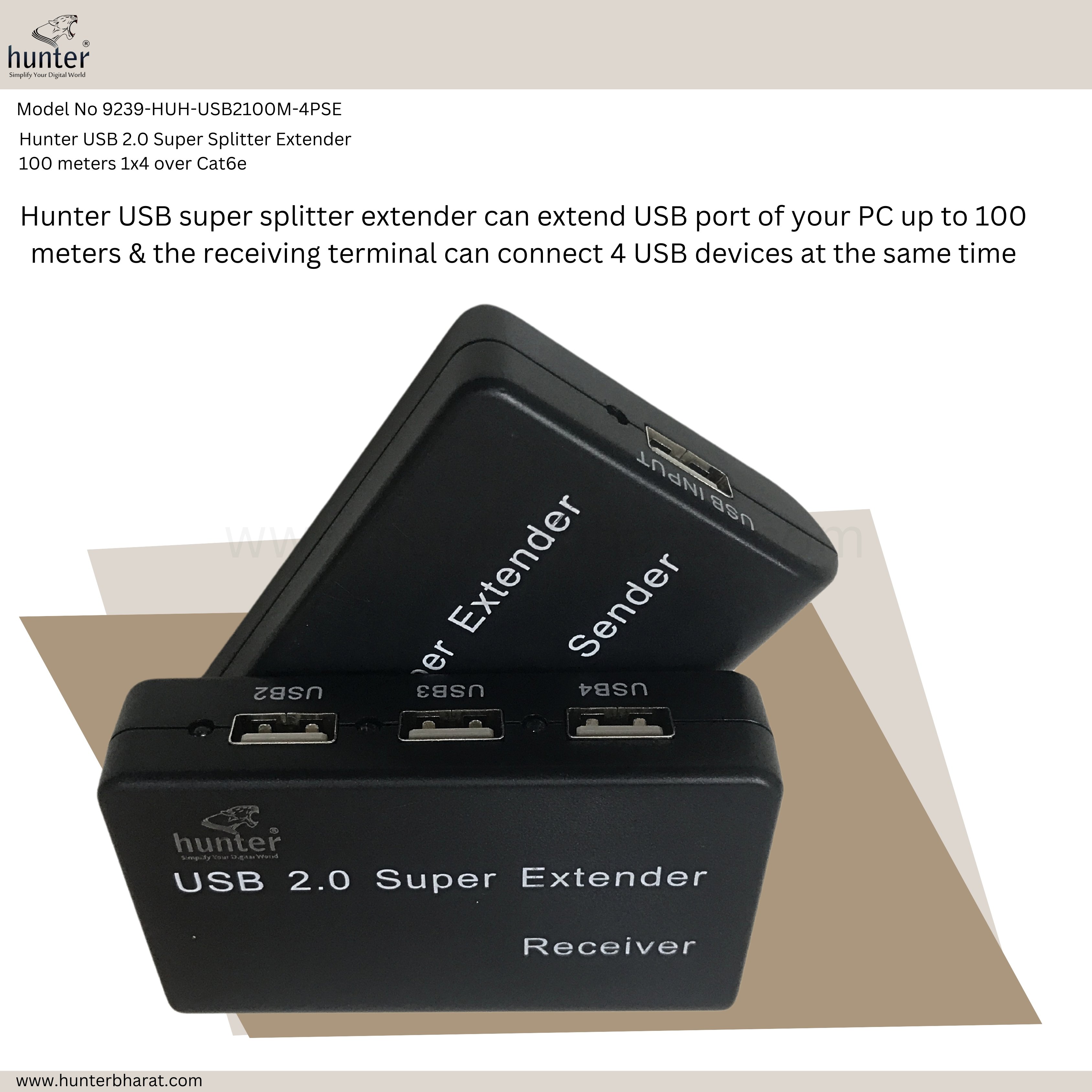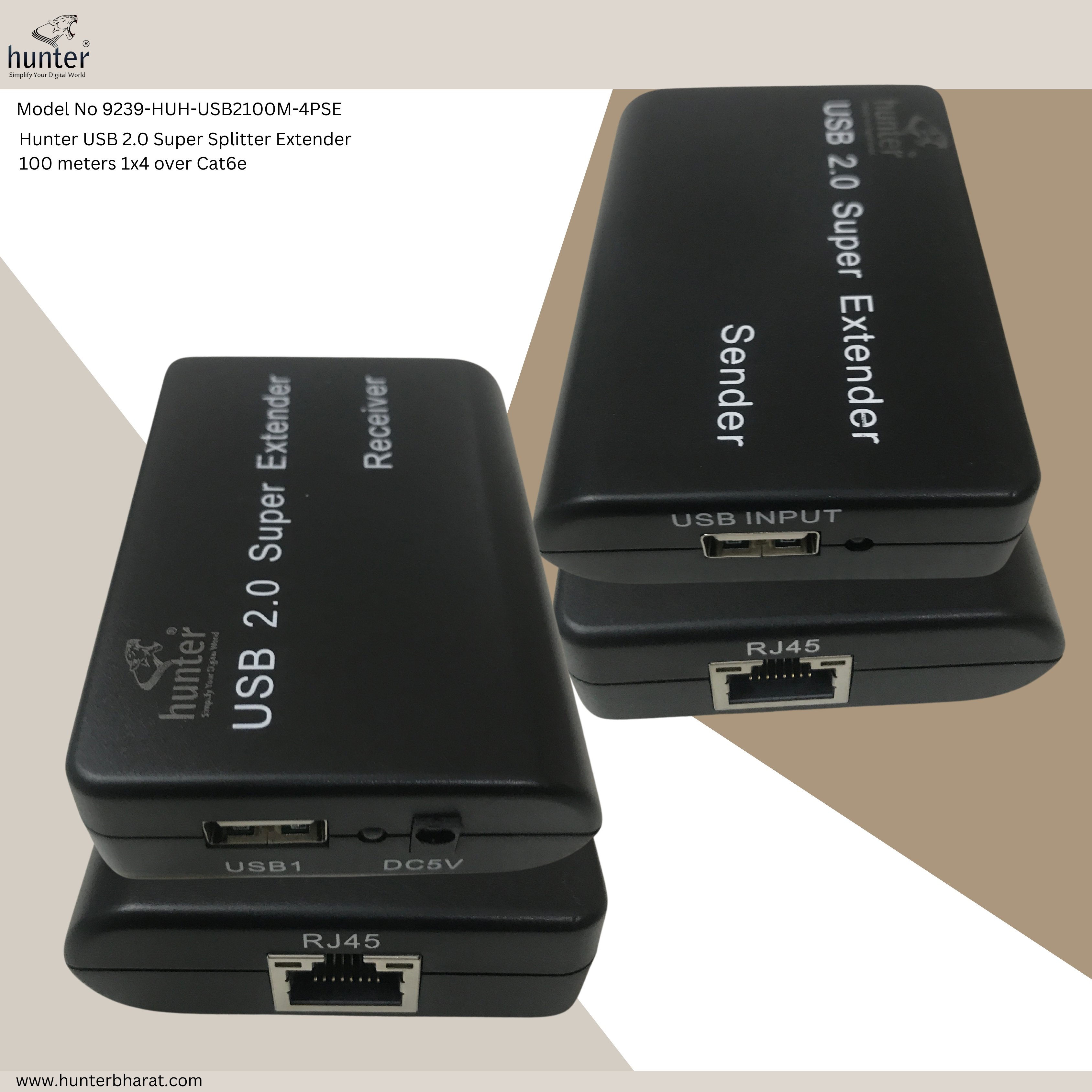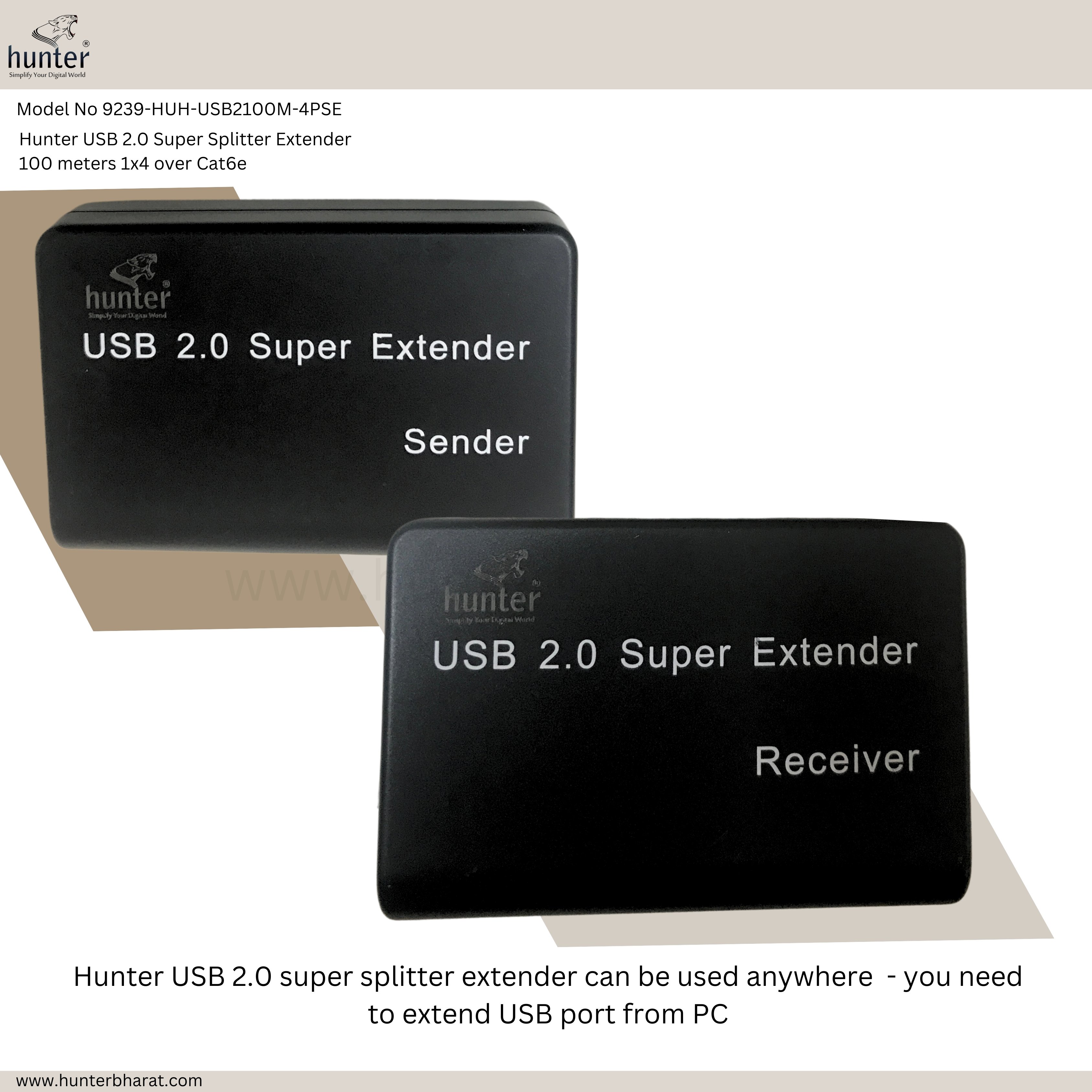 Hunter 9239-HUH-USB2100M-4PSE is a powerful USB 2.0 Super Splitter Extender, stretching connectivity up to 100 meters over Cat6e, supporting 4 USB 2.0 devices, including touch displays, with easy Plug n Play setup. Backward compatible with USB 1.1, hot swap supported. Comes as a set with transmitter & receiver, powered by 5V2A.