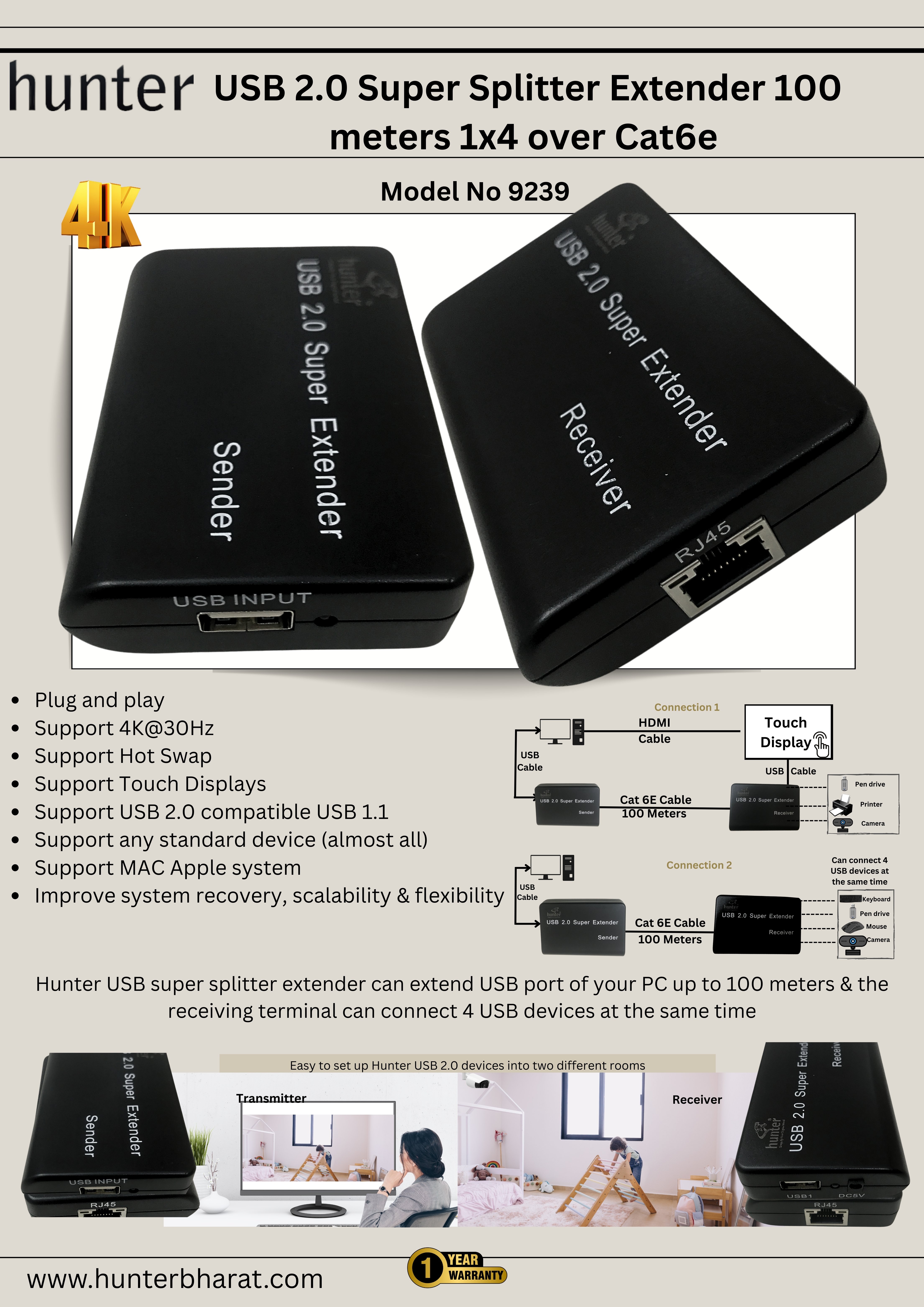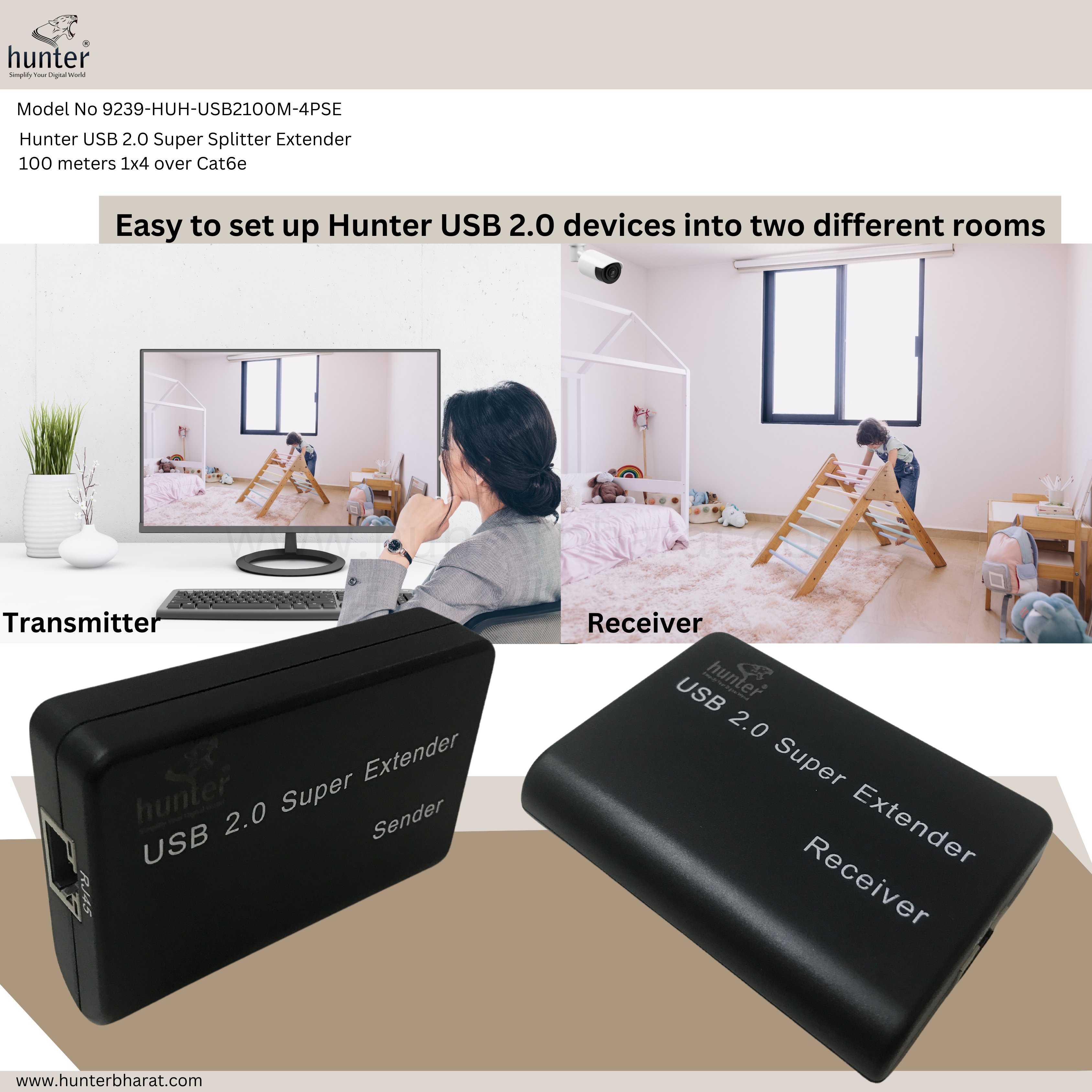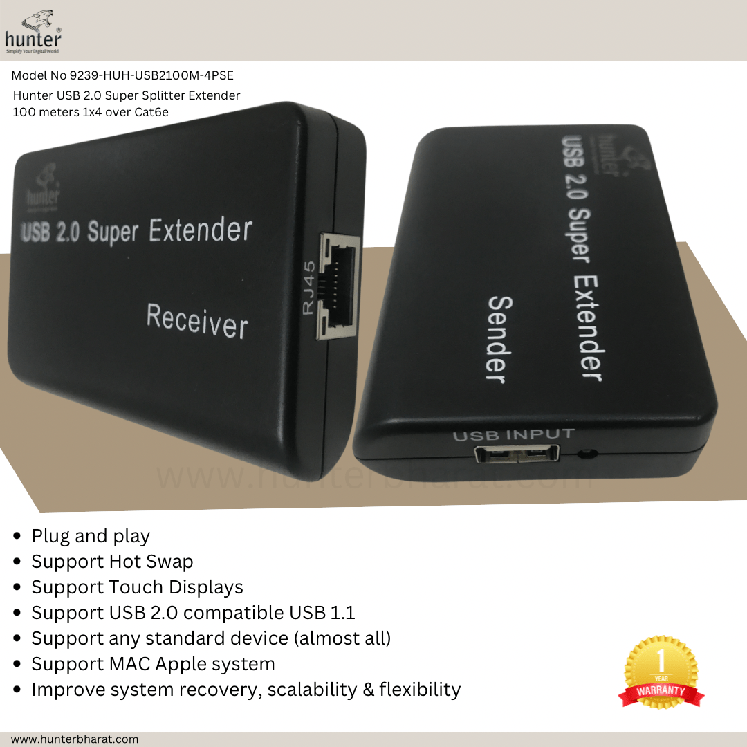 Hunter 9239-HUH-USB2100M-4PSE is a powerful USB 2.0 Super Splitter Extender, stretching connectivity up to 100 meters over Cat6e, supporting 4 USB 2.0 devices, including touch displays, with easy Plug n Play setup. Backward compatible with USB 1.1, hot swap supported. Comes as a set with transmitter & receiver, powered by 5V2A.