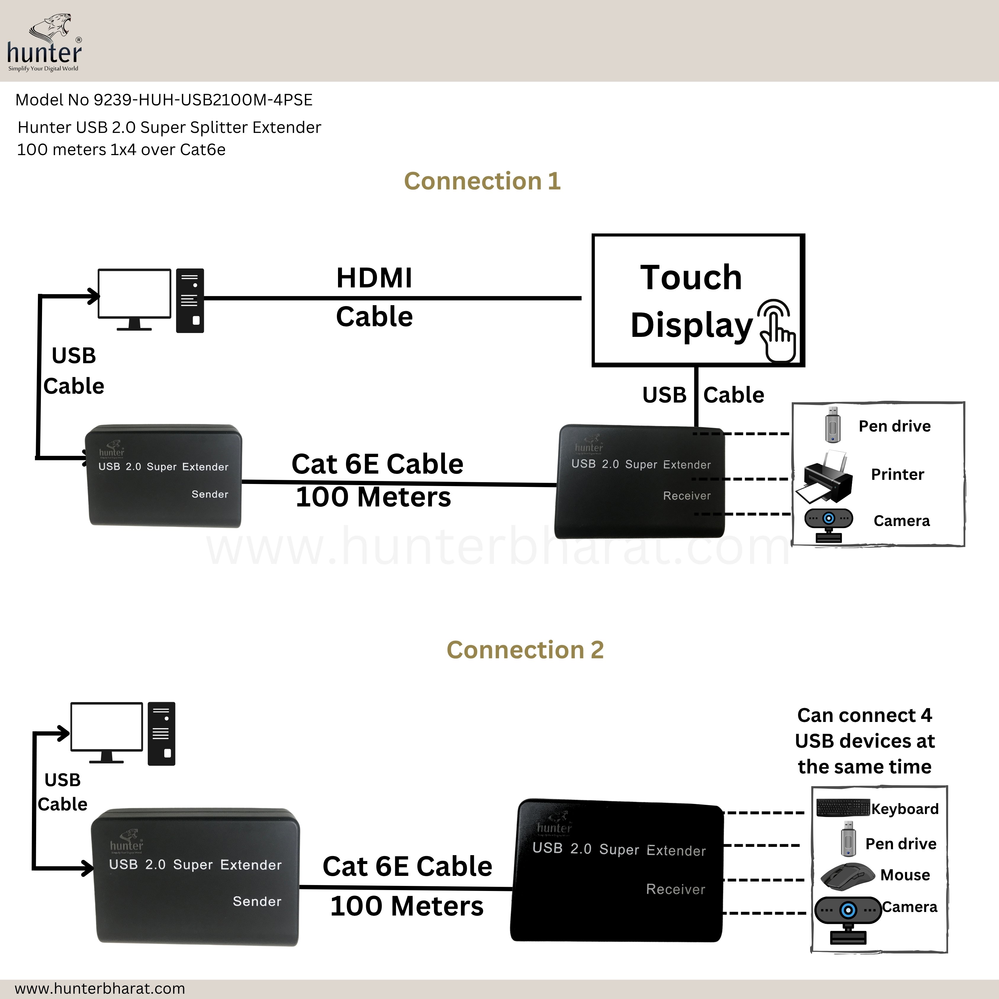 Hunter USB 2.0 Super Splitter Extender (9239-HUH-USB2100M-4PSE) is a device that allows you to extend USB 2.0 connectivity up to 100 meters over a single Cat6e cable. It comes in a set of transmitters and receivers, making it easy to set up and use. This device supports up to 4 USB 2.0 standard devices, such as cameras, USB storage devices, touch displays, keyboards, mice, and more. It is also backward compatible with USB 1.1 devices. The Hunter USB 2.0 Super Splitter Extender features hot-swappable and plug-and-play capabilities for easy installation and use. It also comes with a power supply of 5V2A to ensure stable and reliable power for all connected devices. This device also supports a touch display, which makes it suitable for various applications, including digital signage, point-of-sale systems, and other industrial or commercial uses that require extended USB connectivity.