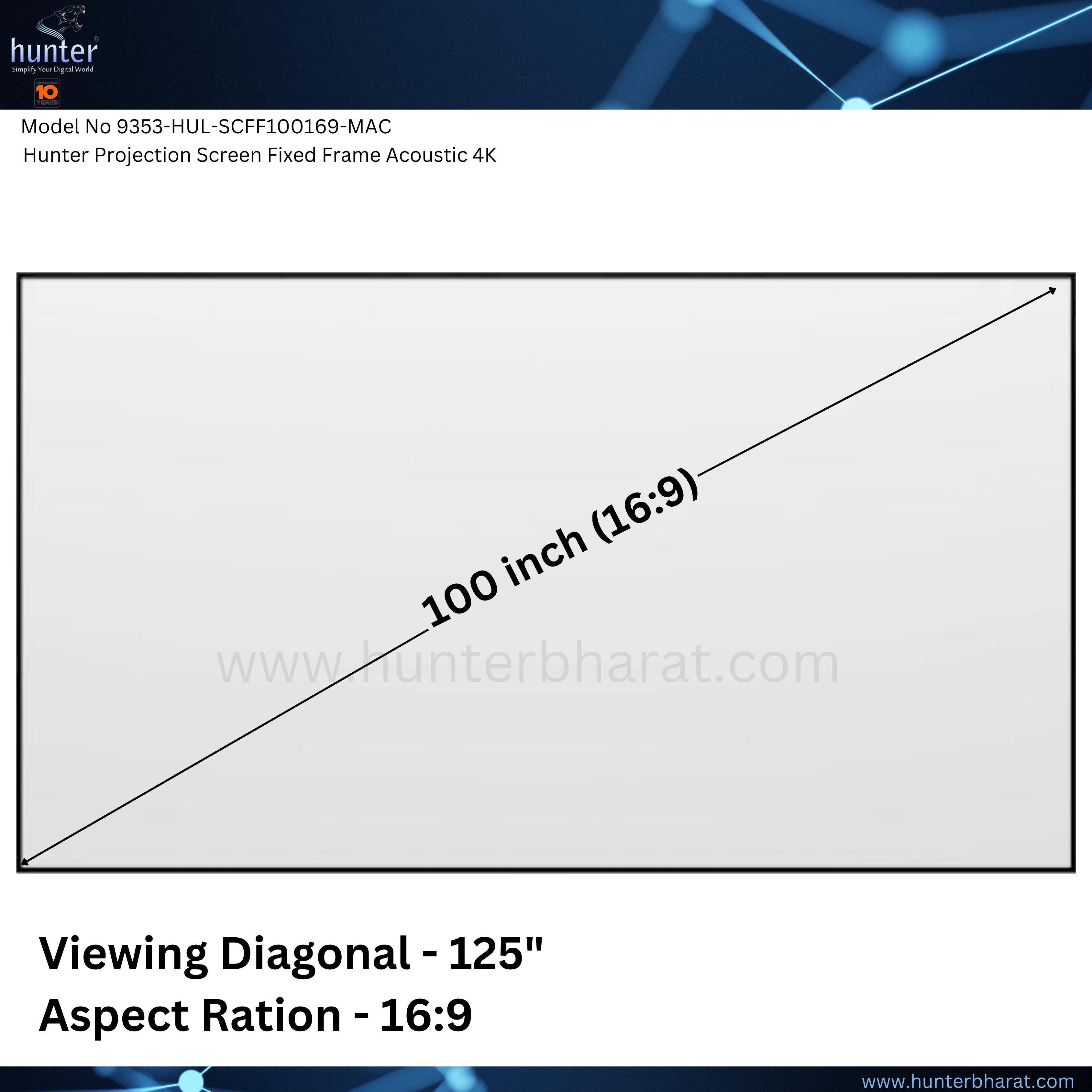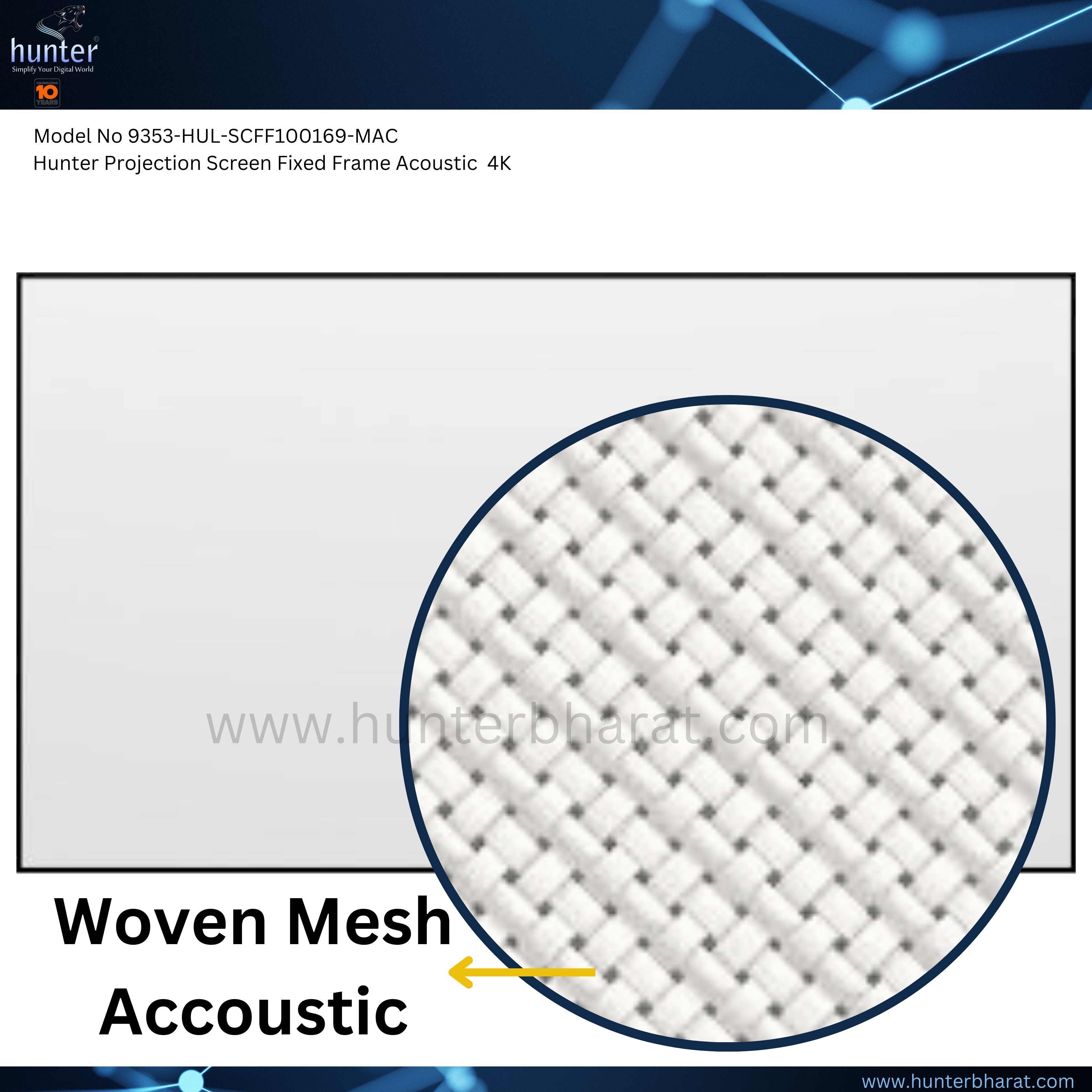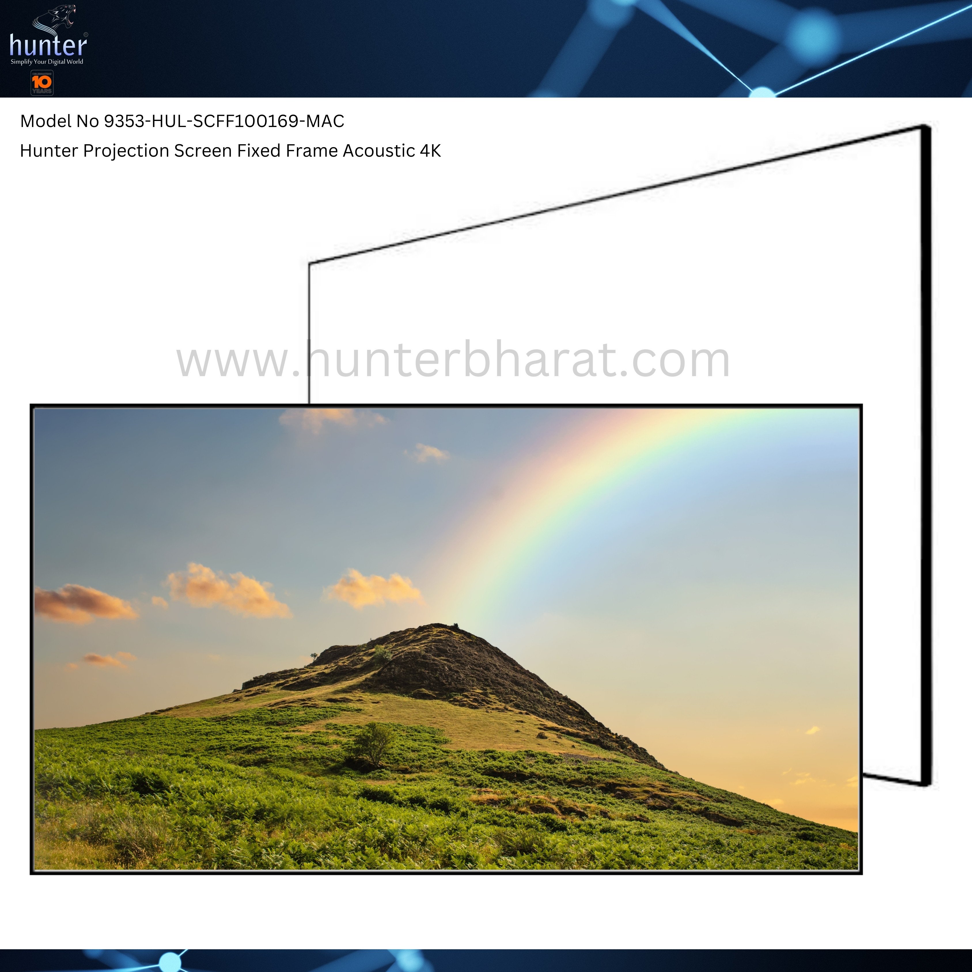 Hunter Fixed Frame Acoustic Transparent 4K Projection Screen offers a premium 100" 16:9 viewing experience. With an acoustic fabric, easy installation, and a classic matte white surface, it delivers superior sound and visual quality.