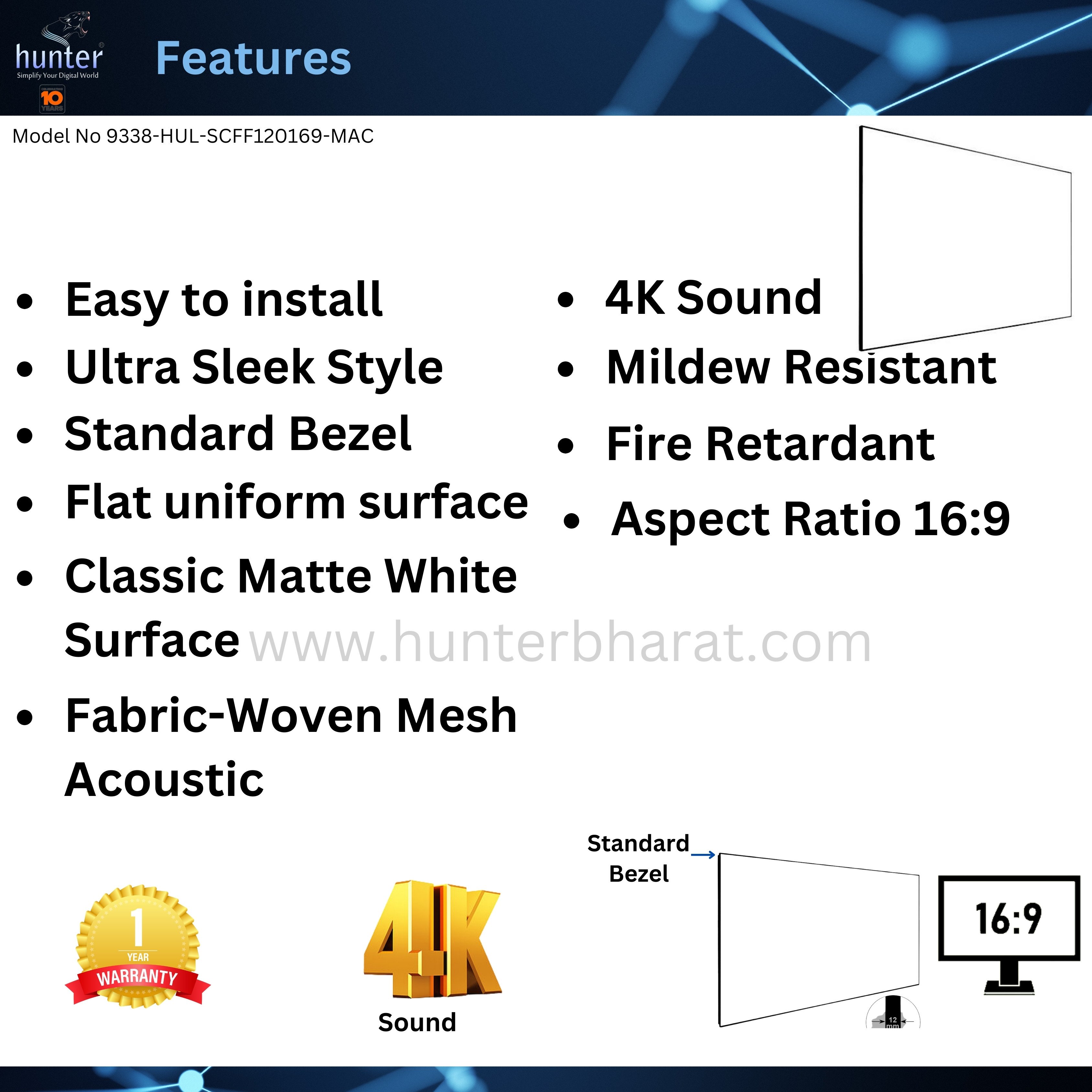 9353HUL-SCFF100169-MAC Hunter Projection Screen presents an exceptional visual and auditory experience, featuring a 100-inch diagonal size with a 16:9 aspect ratio. This classic fixed frame screen is meticulously designed for 4K content, delivering stunning visuals with a flat and uniform surface. Crafted with premium acoustic fabric woven mesh, the screen enhances audio clarity and maintains a stylish and sleek appearance. The standard bezel adds a touch of elegance, providing a seamless frame for a cinematic feel. The mildew-resistant and fire-retardant properties ensure long-lasting durability and safety. With an easy installation process, this projection screen brings convenience and sophistication to any space, offering a premium viewing and listening environment for a truly immersive home theater experience.